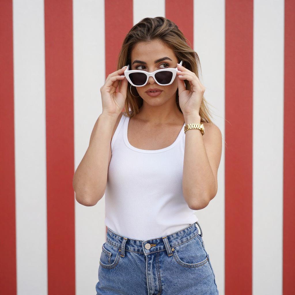 Photograph of a young woman with light brown hair, wearing a white tank top and high-waisted blue jeans. She holds white-framed sunglasses near her face with both hands, looking to the side. She has hoop earrings, a gold watch, and a confident expression. The background features vertical red and white stripes.