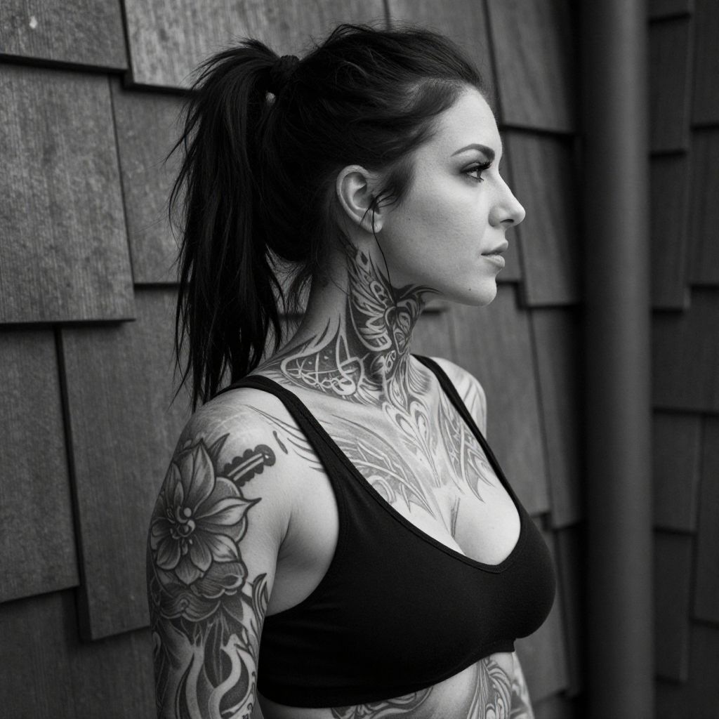 Black-and-white photo of a heavily tattooed woman with long, messy dark hair in a ponytail. She's wearing a low-cut black top, showcasing intricate tattoos on her neck, chest, and arms, including a large floral design on her chest and a detailed dragon on her shoulder. She's gazing to the right, standing against a wooden shingle wall. The image has a gritty, edgy feel.