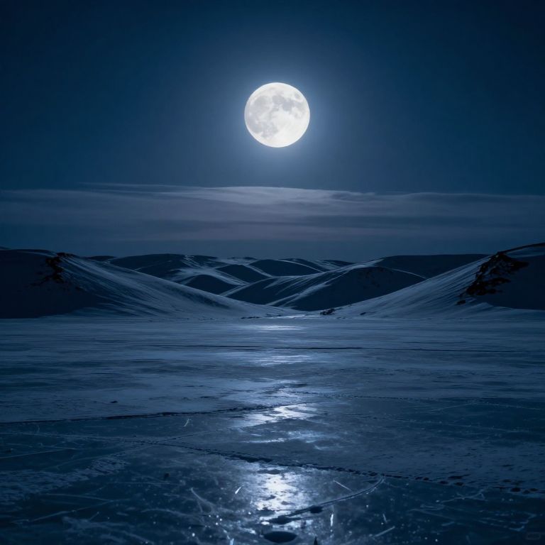 Photograph of two silhouetted figures standing on a frozen, icy landscape, facing a large, glowing red full moon in the sky. The figures are positioned side by side near the center, with long shadows extending behind them on the ice. The moon dominates the upper half of the image, casting a pinkish-red hue over the scene. The sky is a gradient of dark to light purple, and the ice has a smooth, reflective texture. The overall atmosphere is mystical and serene, with a strong contrast between the dark silhouettes and the vibrant moon.