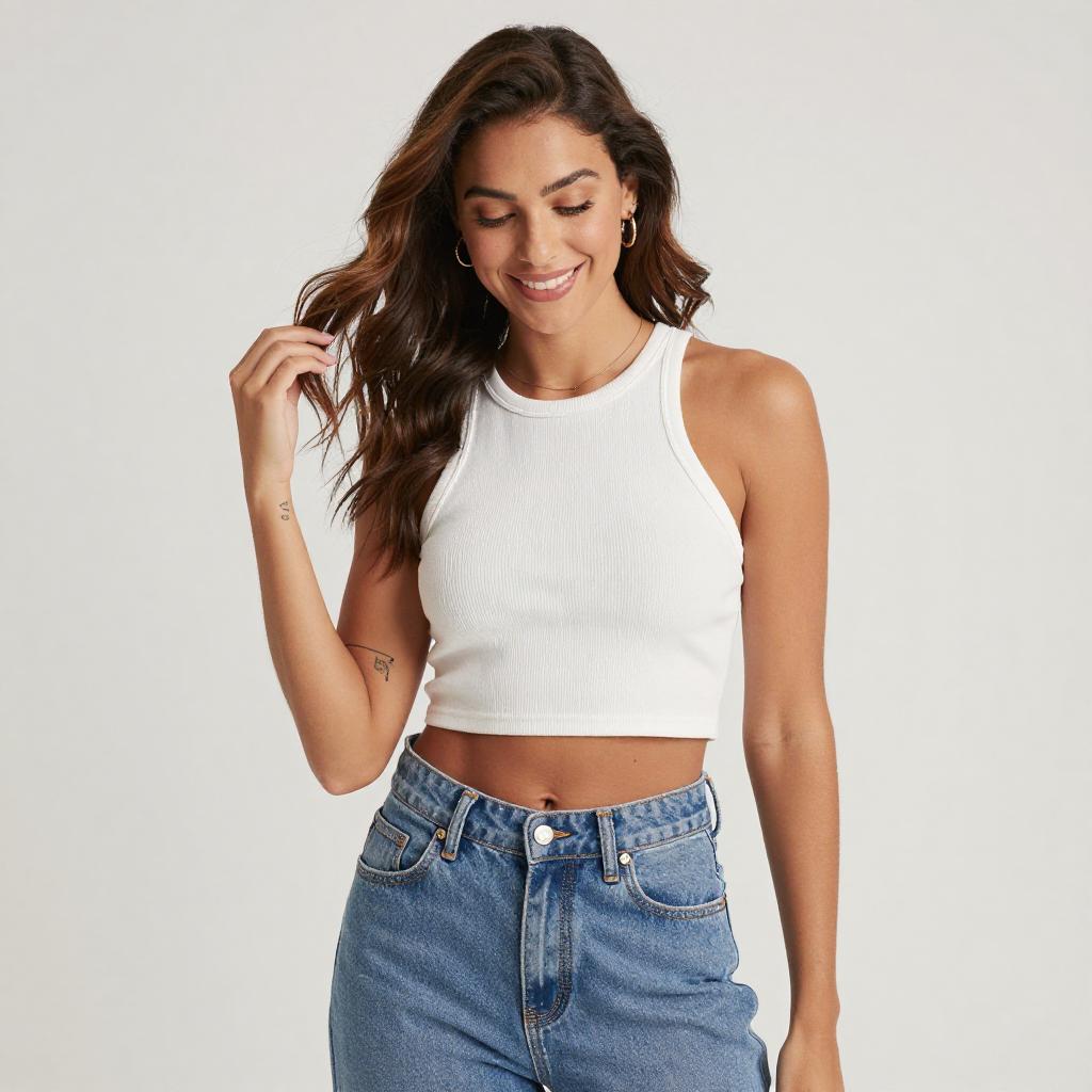 Photograph of a young woman with long, wavy brown hair and a tan complexion. She's wearing a white, ribbed, crop-top tank that shows her toned midriff and high-waisted, blue denim jeans. She's standing against a bright white background, smiling and looking down with one hand in her hair. She has a small tattoo on her right forearm. The image has a casual, relaxed vibe.