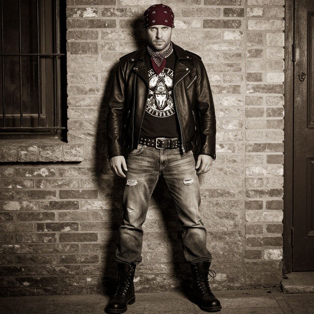 A man, black leather jacket, distressed denim jeans, dark red bandana, studded black leather belt, combat boots, graphic band t-shirt, rustic brick exterior, sepia effect, confident expression Man has masculine face and piercing eyes