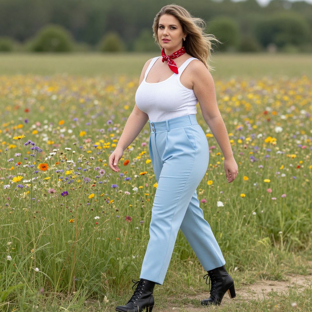 A lanky woman in a Diego Fazio style, wearing a white ribbed tank top and light blue high-waisted trousers, strolls through a vibrant wildflower meadow, her black lace-up heeled ankle boots crunching softly on the ground. A red bandana around her neck flutters gently in the breeze as she admires the colorful blooms around her. Sexy. Pretty face and beаutiful eyes. Big breasts