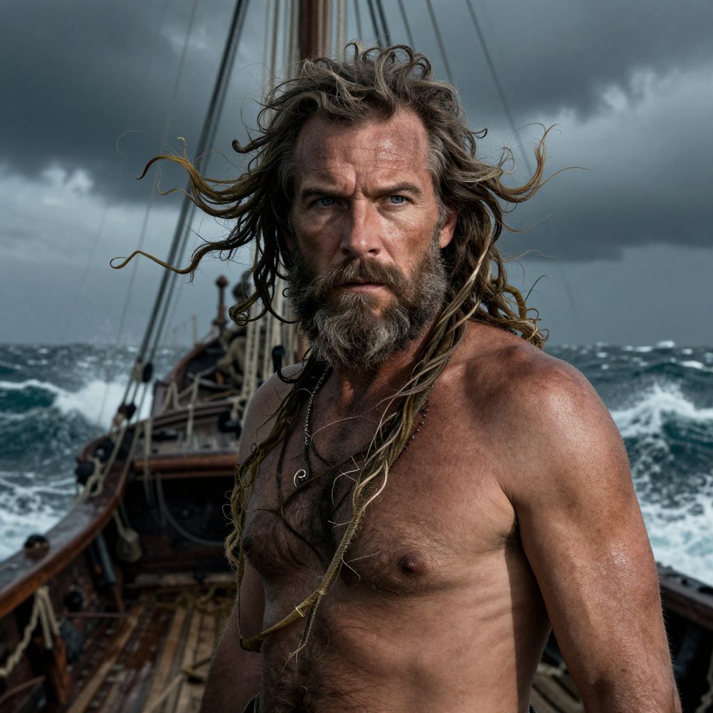 Photograph of a muscular, bearded man with long, windswept hair, shirtless, standing on a stormy ship deck, waves crashing
