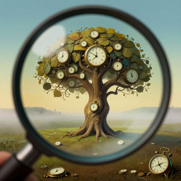 Envision a dreamlike landscape reminiscent of Salvador Dali's iconic paintings, where an immense tree with contorted branches and leaves crafted from timepieces lies across a foggy expanse. The scene is captured from an low vantage point, as if observed through a magnifying glass or microscope, unveiling intricate details on the bark texture and clock components strewn on the ground. This striking image conveys feelings of timeless wonder, seamlessly merging the fantastical with the familiar to create an unforgettable visual experience.