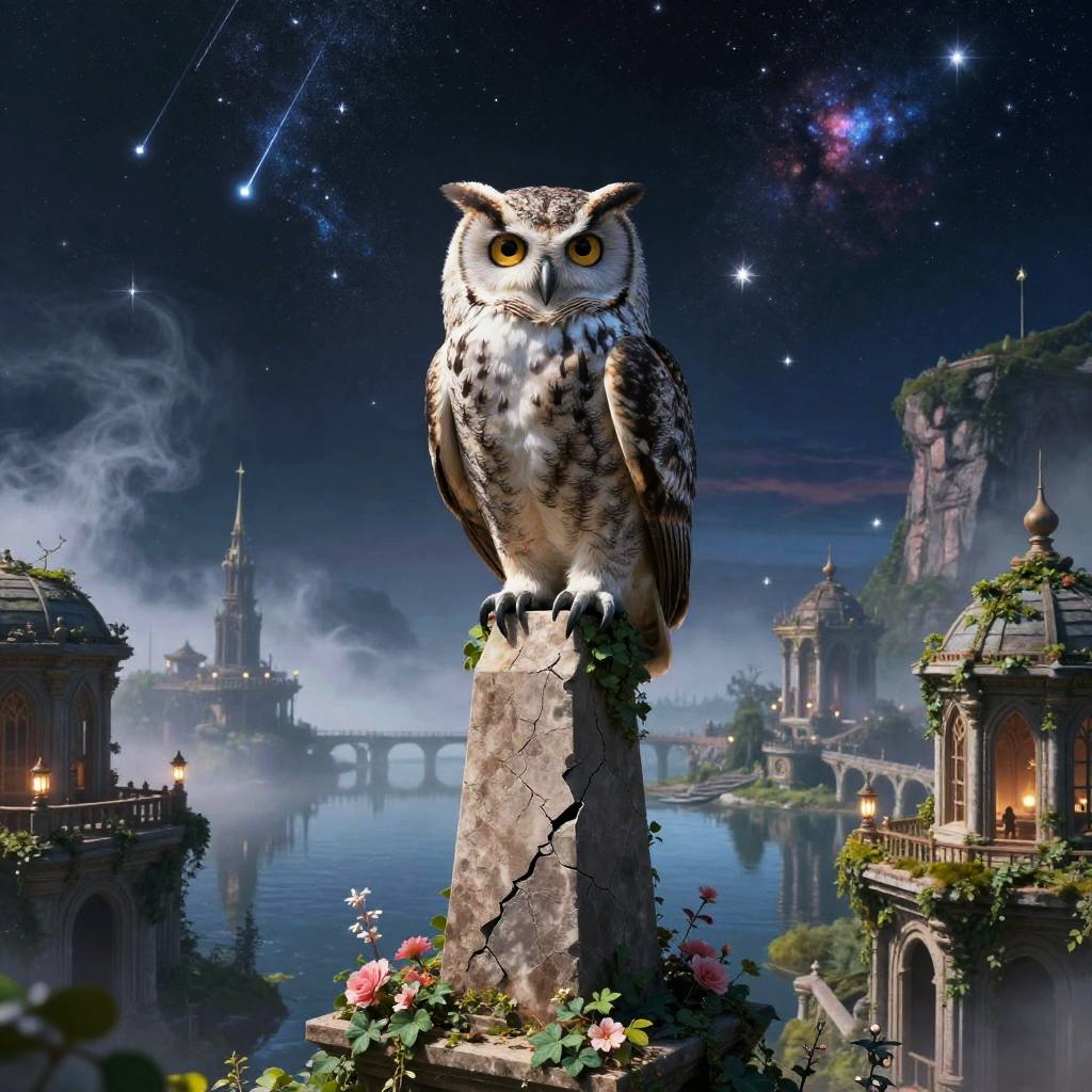 A gigantic owl perched solemnly on a cracked stone obelisk covered in ivy blooms amidst abandoned city rooftops. The serene scene is set by tranquil waters reflecting a starry midnight blue sky filled with shooting stars and nebulae. Distant gothic spires and arched bridges emerge from the ethereal mist. Lantern-lit sanctuaries and moss-covered terraces enhance the dreamlike atmosphere, with volumetric fog and soft rim light adding depth and cinematic quality.