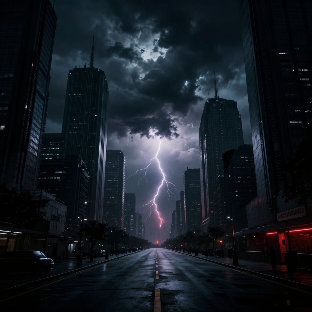 Photograph-like digital artwork depicting a dramatic cityscape at night. Tall skyscrapers with dark, reflective glass surfaces frame a wet, empty street in the foreground. A vivid lightning bolt, white at the top and pink at the bottom, strikes from a turbulent, cloud-filled sky, illuminating the scene. The street reflects the sky's intense colors, while scattered red and white lights from distant vehicles add subtle contrast. The overall mood is dark, intense, and electrifying, with a strong focus on the dramatic lightning strike against the urban backdrop.