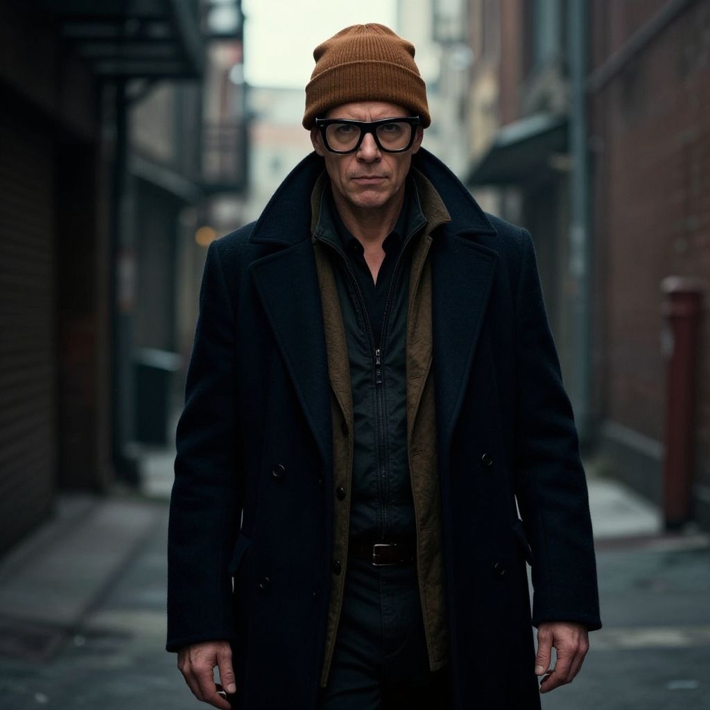 Leon the Professional costume, iconic look featuring a brown beanie, thick glasses, and a layered deep coat, set against a gritty city alley, dramatic shadows, intense atmosphere, hyper-realistic digital painting with cinematic color grading.