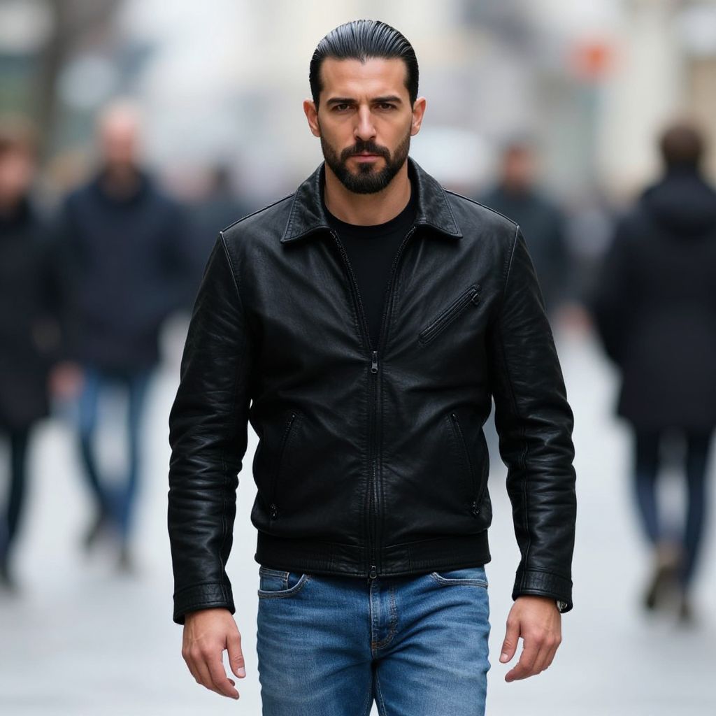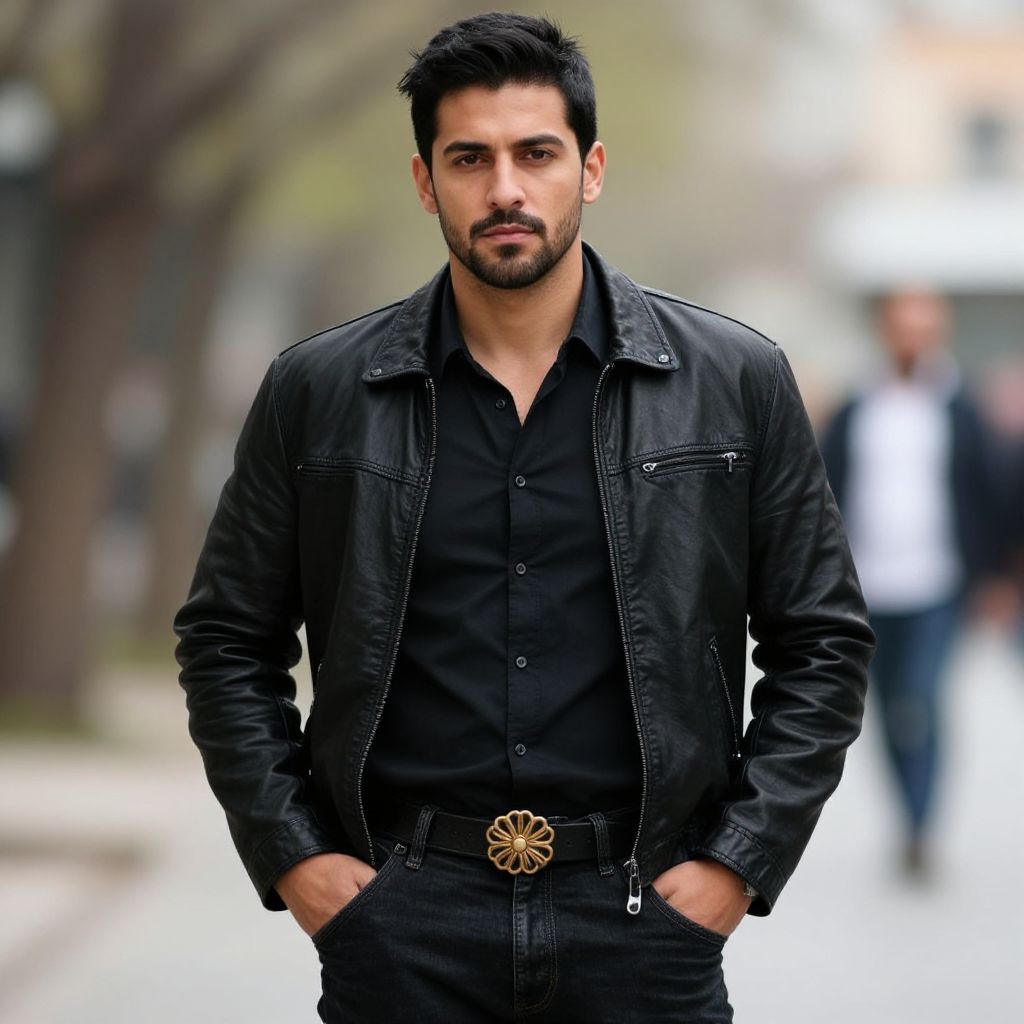 "outfit big man costume, 1boy, male focus, solo, black hair, facial hair, white pants, blurry, pants, blurry background, looking at viewer, coat, jacket, shirt, long sleeves, buttons, outdoors, beard, realistic, mustache Realistic photo of casual sexy person with pretty face"
