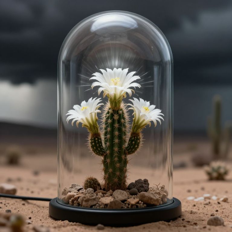 A solitary cactus blooms inside a glass vacuum at the center of a desert storm, radiating soundwaves instead of light.