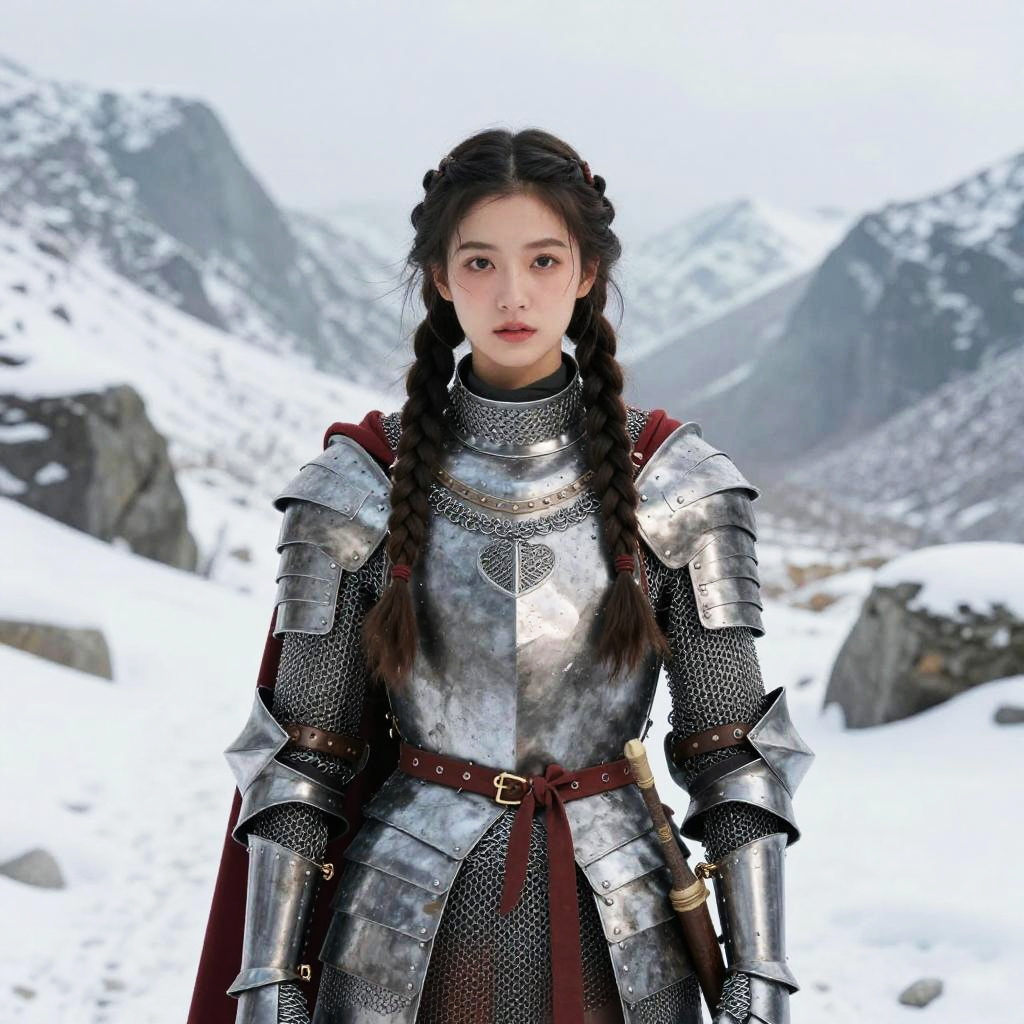 Warrior Braid hairstyle on young female knight, wearing silver chainmail with a crimson tabard, in snow-covered mountain pass, captured in fashion editorial style with cold, overcast daylight.