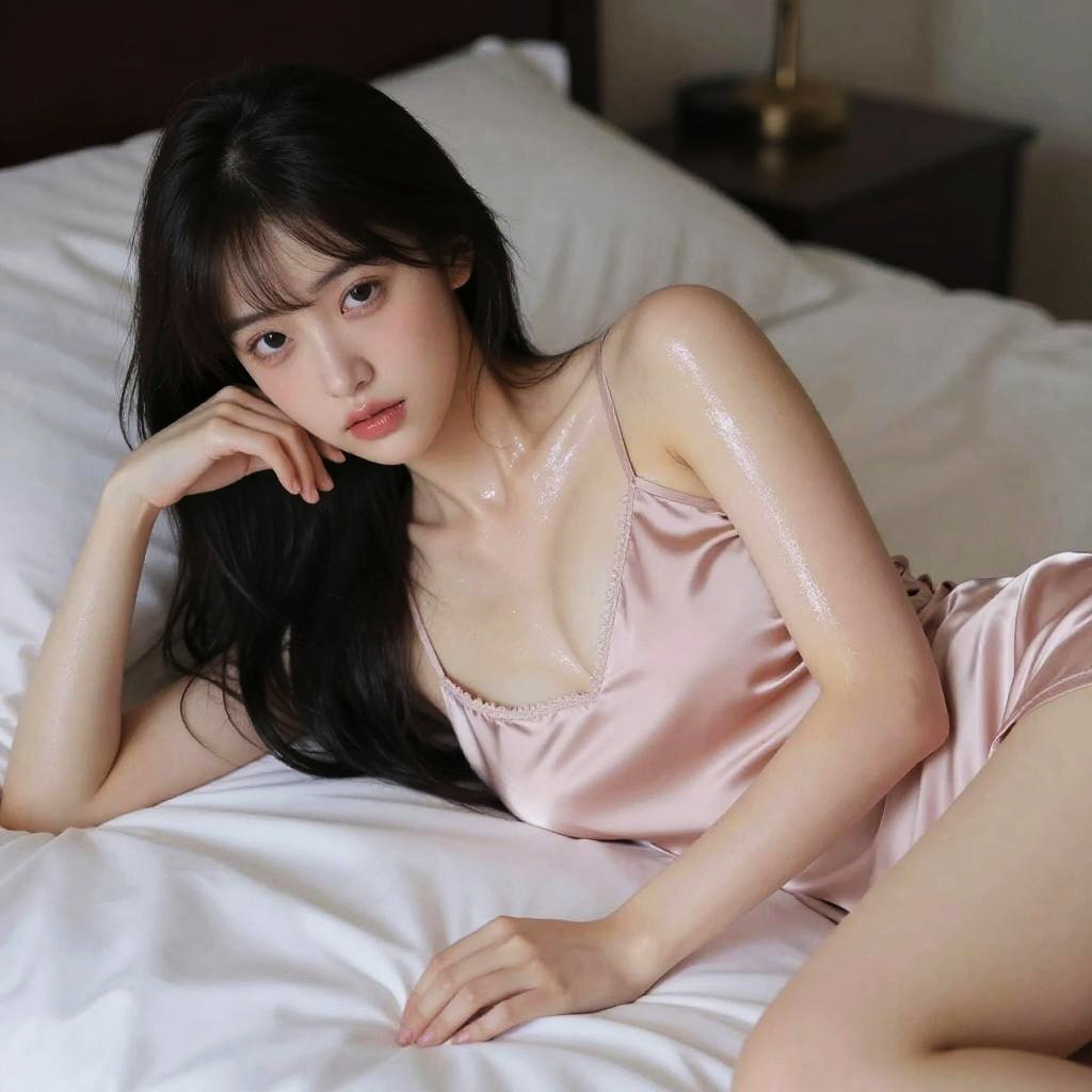 (best quality), (realistic, photo-realistic:1.3), (masterpiece:1.3), extremely delicate and beautiful, extremely detailed, CG, unity, 8k, amazing, finely detail, ultra-detailed, highres, absurdres, (((black long hair, bangs))), beautiful detailed girl, detailed fingers, best shadow, extremely detailed eyes and face, beautiful detailed nose, beautiful detailed hand, beautiful detailed eyes, beautiful delicate glossy lips:0.8, (glossy face and body skin:1.1), ((oily body skin:1.1)), (closed mouth:1.2), (1 girls), solo, ((thigh:1.4)), cute, sexy body, (innocent face), young, ((dramatic light)), (looking at viewers), (nsfw), (side part:1.2), (light pink silk nightgown:1.6), posing, ((lying on bed:1.3)), ((on back)), dynamic angle, (bed:1.2), large breasts