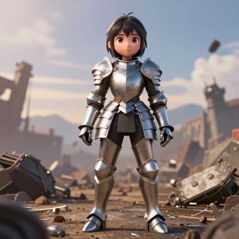 CGI image of a young, anime-style character with large, expressive brown eyes and short black hair. The character is standing confidently in the center of a ruined, medieval-style battlefield. They are wearing full silver armor with reflective surfaces, including a chest plate, shoulder guards, gauntlets, and shin guards. The armor has a shiny, metallic texture. The background features a clear blue sky with some clouds, and distant, damaged buildings with broken walls and debris scattered across the ground. The sunlight casts soft shadows, enhancing the character's determined stance. The overall style is vibrant and detailed, with a focus on the character's youthful and heroic appearance.