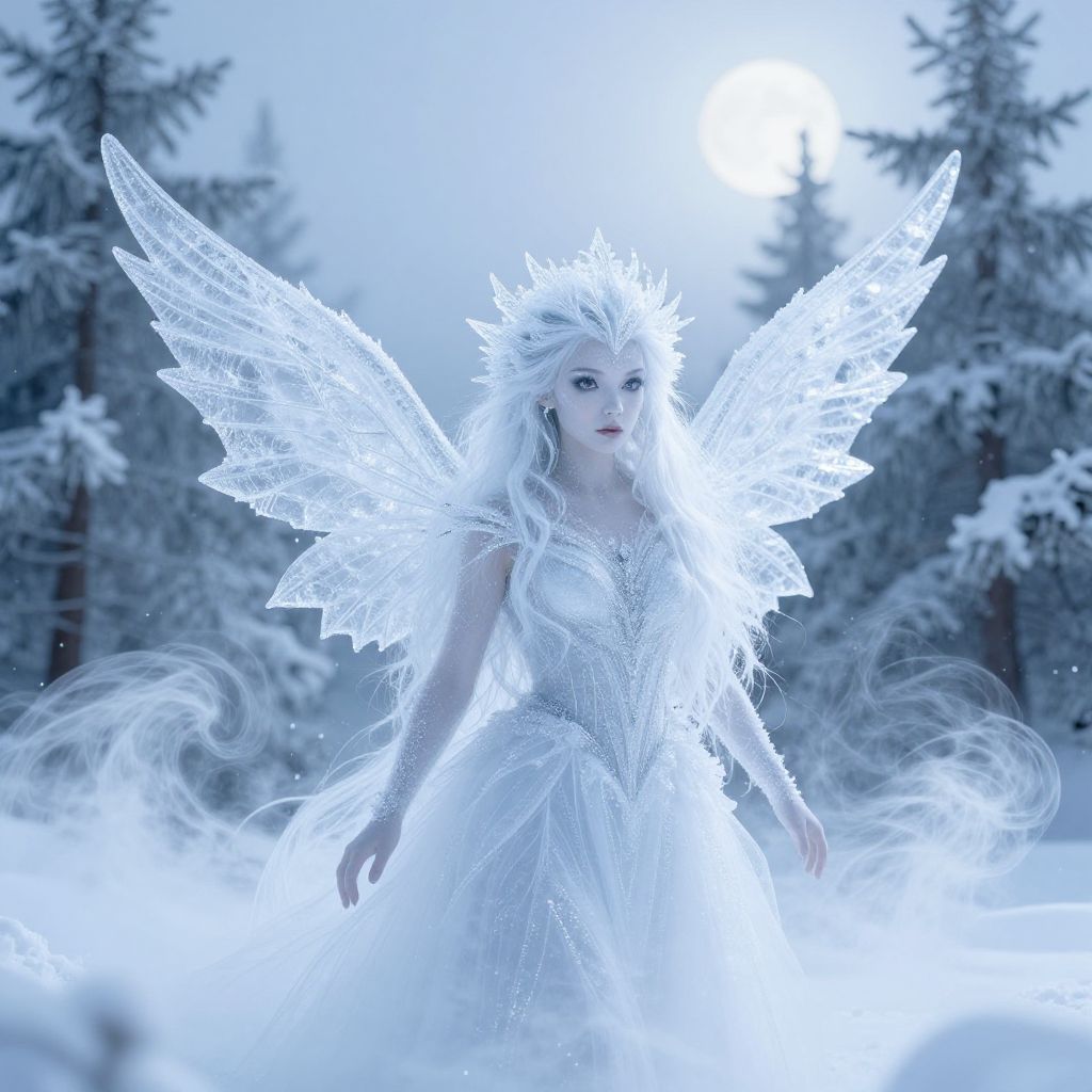 Photograph of a fair-skinned woman with long white hair, glowing ice wings, and a snow-covered dress, standing in a snowy forest. Eth
