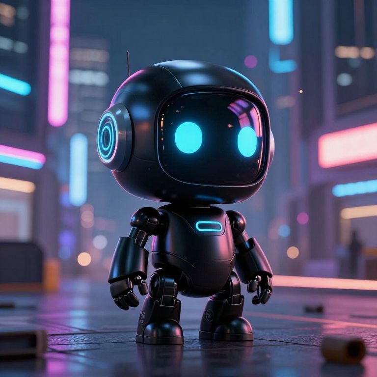 A small black robot character, compact and futuristic design, standing in a high-tech cityscape at night, neon lights reflecting off its smooth surfaces, cyberpunk aesthetic.