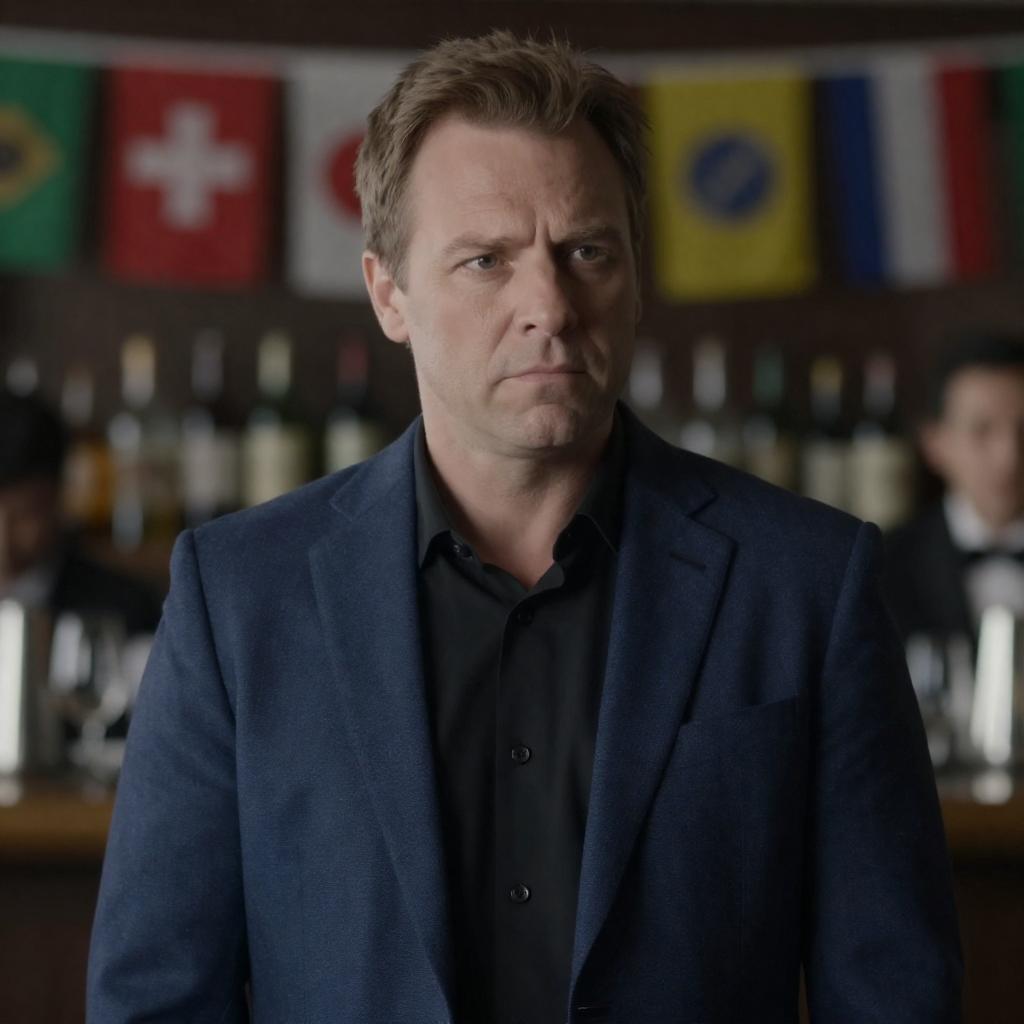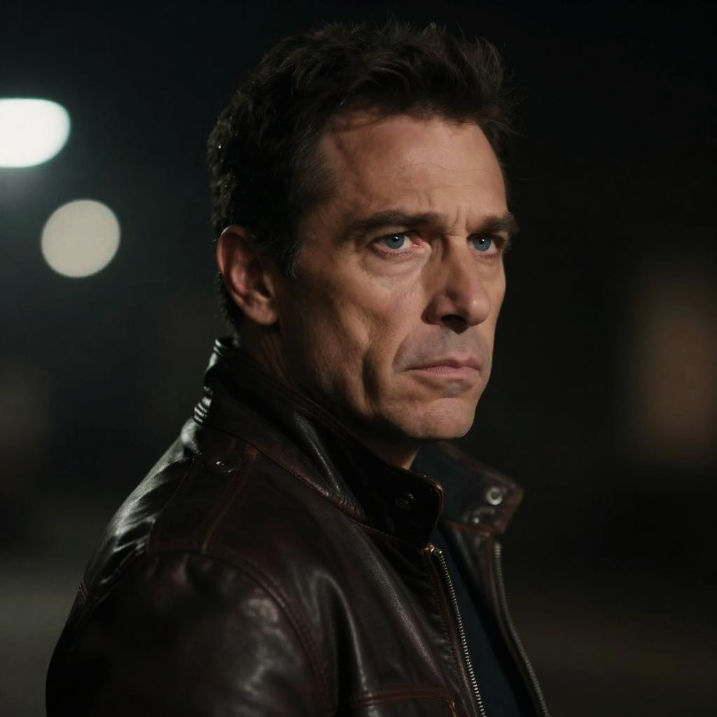 Photograph of a middle-aged man with short, dark, slightly graying hair and a serious expression. He has a few visible bruises on his face and is wearing a black button-up shirt. He is in a dimly lit room with a lamp and a blurred poster in the background. The lighting highlights his facial features and bruises.