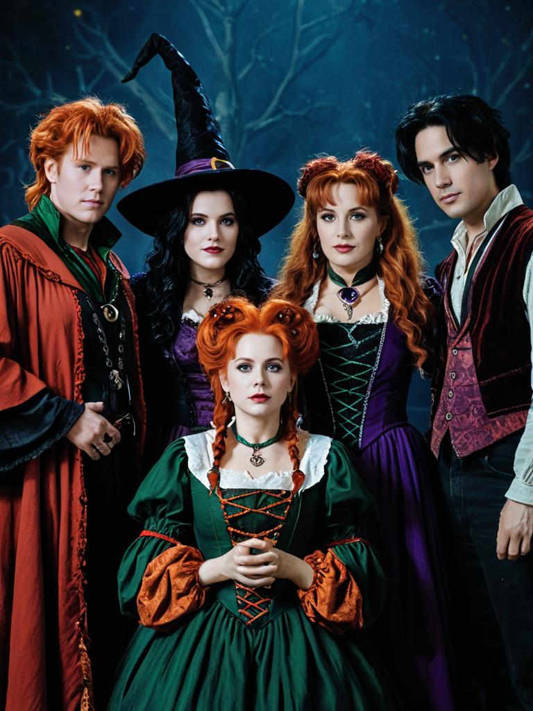 Group in Hocus Pocus Cosplay, photorealistic detailed studio group portrait