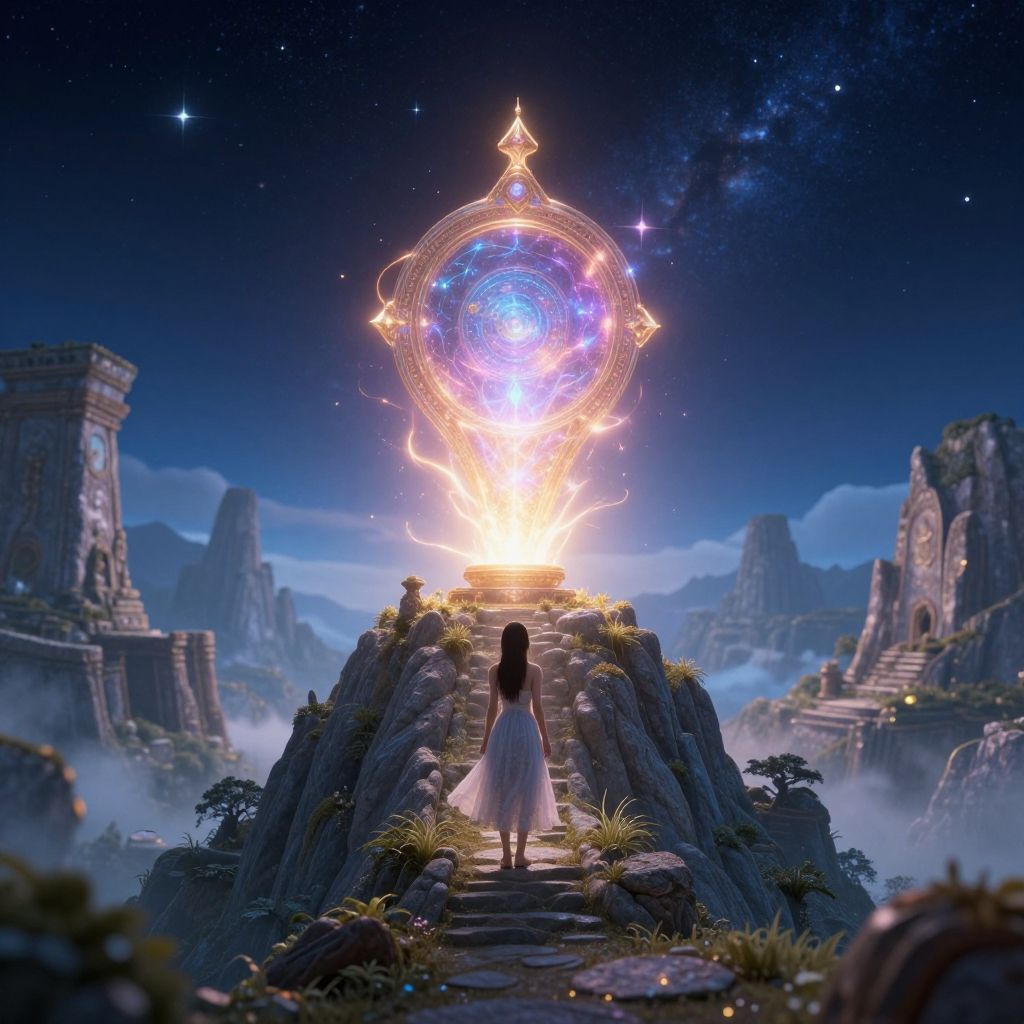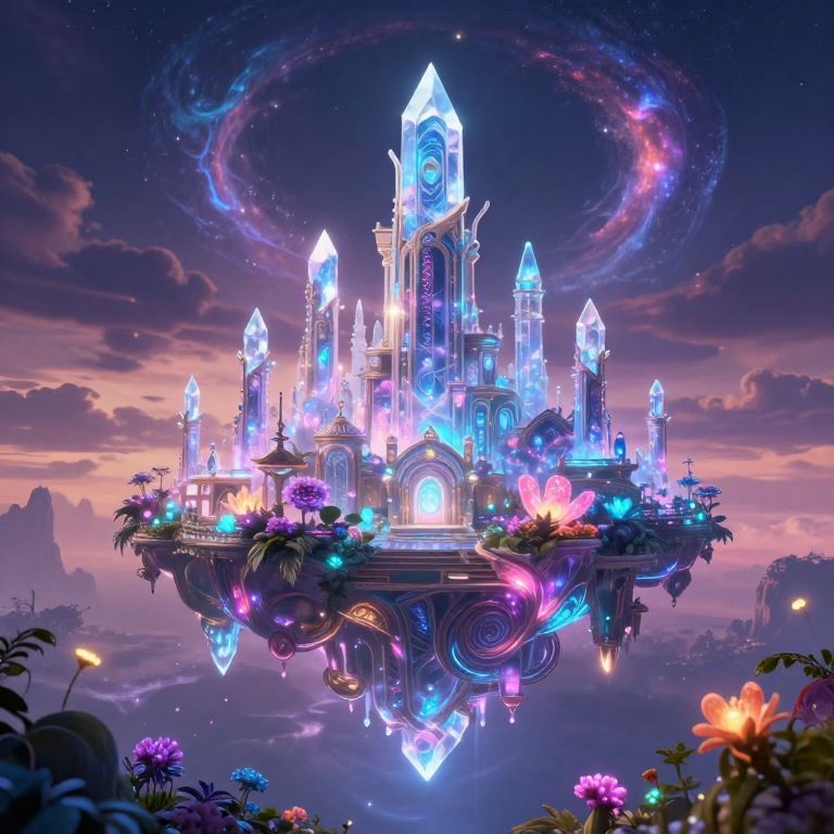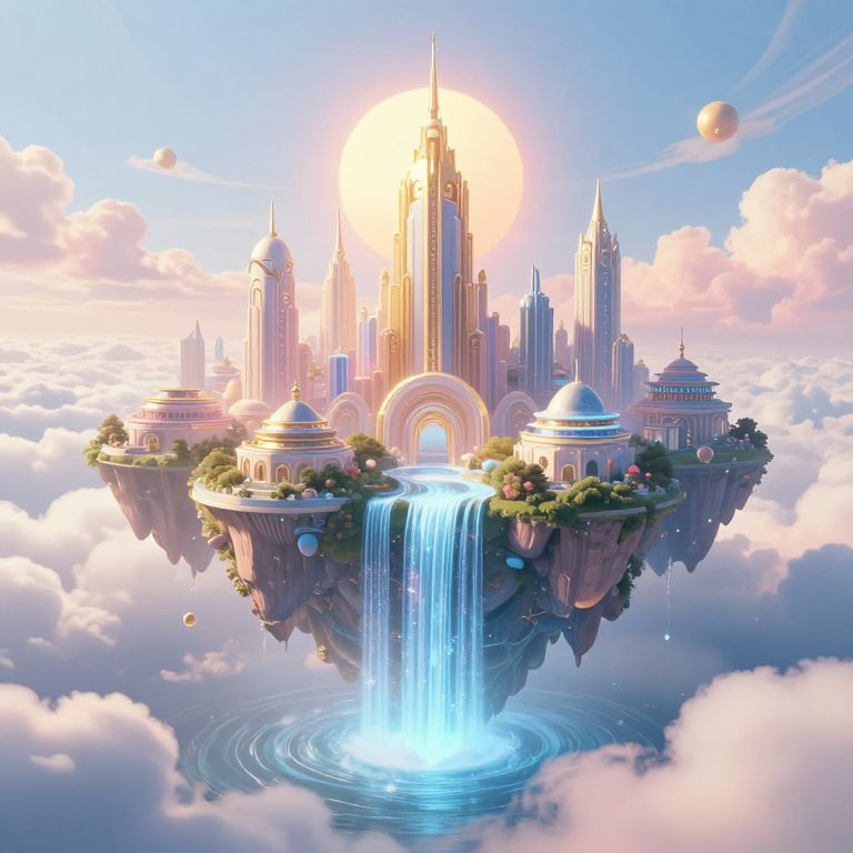 Empyrean heavens filled with radiant stars and luminous nebulae, majestic floating palaces carved from crystal and light, soft beams of pure energy streaming through celestial arches, an otherworldly paradise above the clouds, rich colors, surreal and dreamy mood