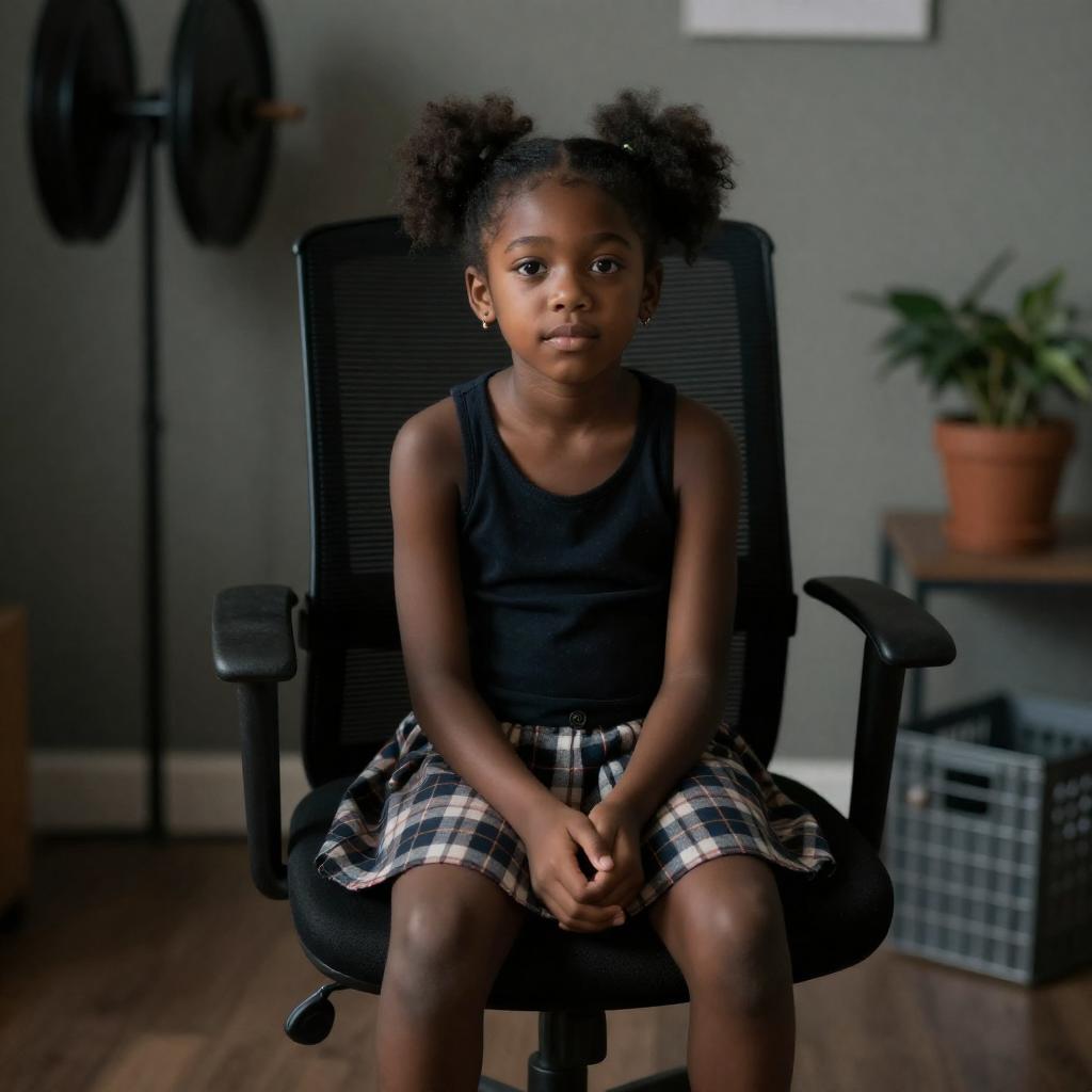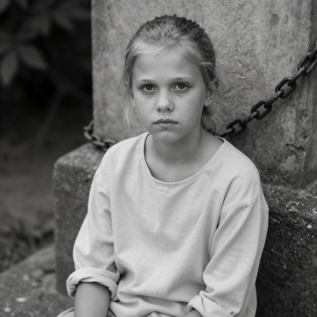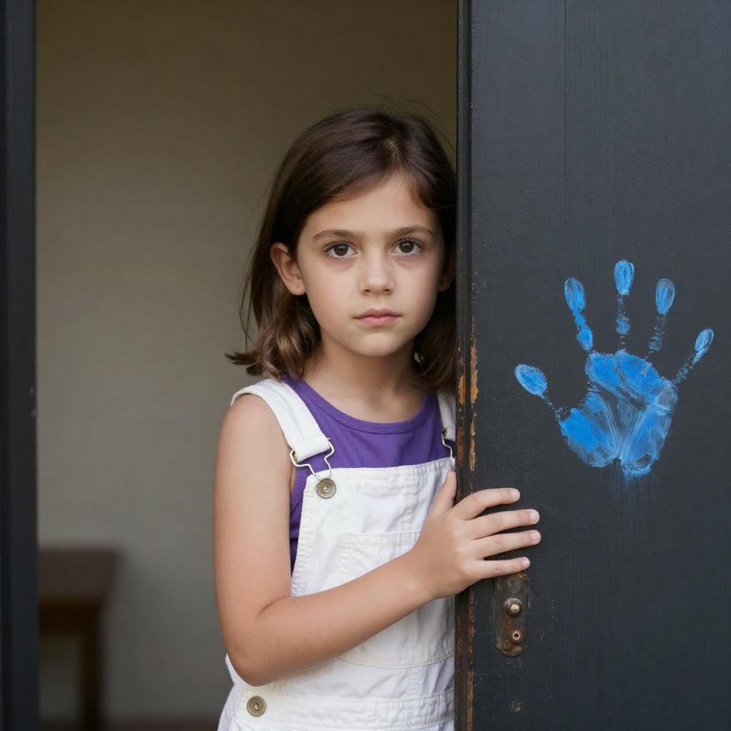 Young girl with medium-length brown hair, wearing a white overalls over a purple shirt, peeks through a dark, slightly worn door. Blue handprint on the right door. Soft, natural light from outside. Intense, curious expression. Background shows a blurry, ured wall.