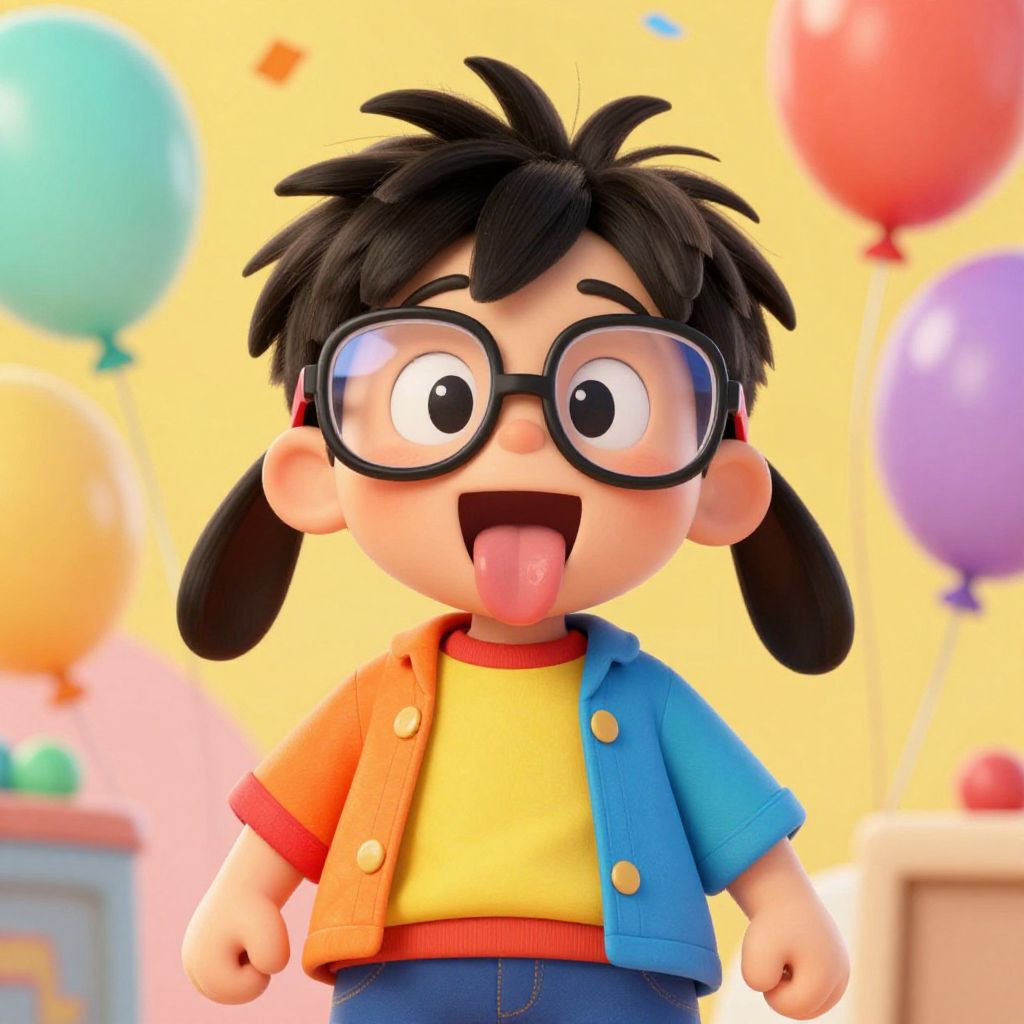 Goofy looking kid with messy hair and oversized glasses, wearing a colorful mismatched outfit, making a silly face with tongue out, playful cartoon style, vibrant background filled with balloons and confetti, cheerful and fun atmosphere