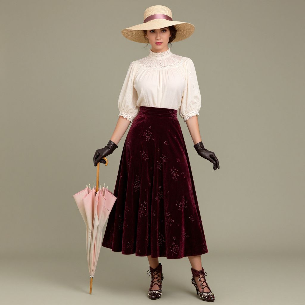 Full body shot, slim woman, elegant high-neck blouse, lace trim, puffed sleeves, soft cotton fabric, cinched waist, flowing A-line skirt, ankle-length, rich burgundy velvet, delicate floral embroidery, wide-brimmed straw hat, satin ribbon, vintage leather gloves, lace-up ankle boots, intricate beading, pastel parasol, classic Gibson Girl silhouette, timeless elegance Sexy. Pretty face and beаutiful eyes. Big breasts