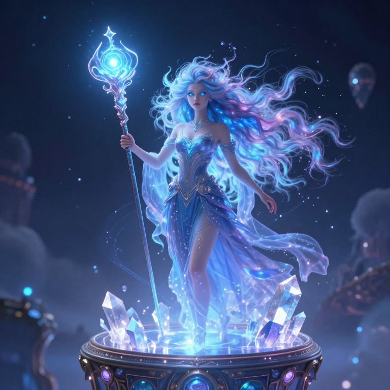 Digital artwork of a blue-haired, ethereal sorceress with glowing blue eyes, wearing a flowing, translucent dress, standing on a crystal-enc