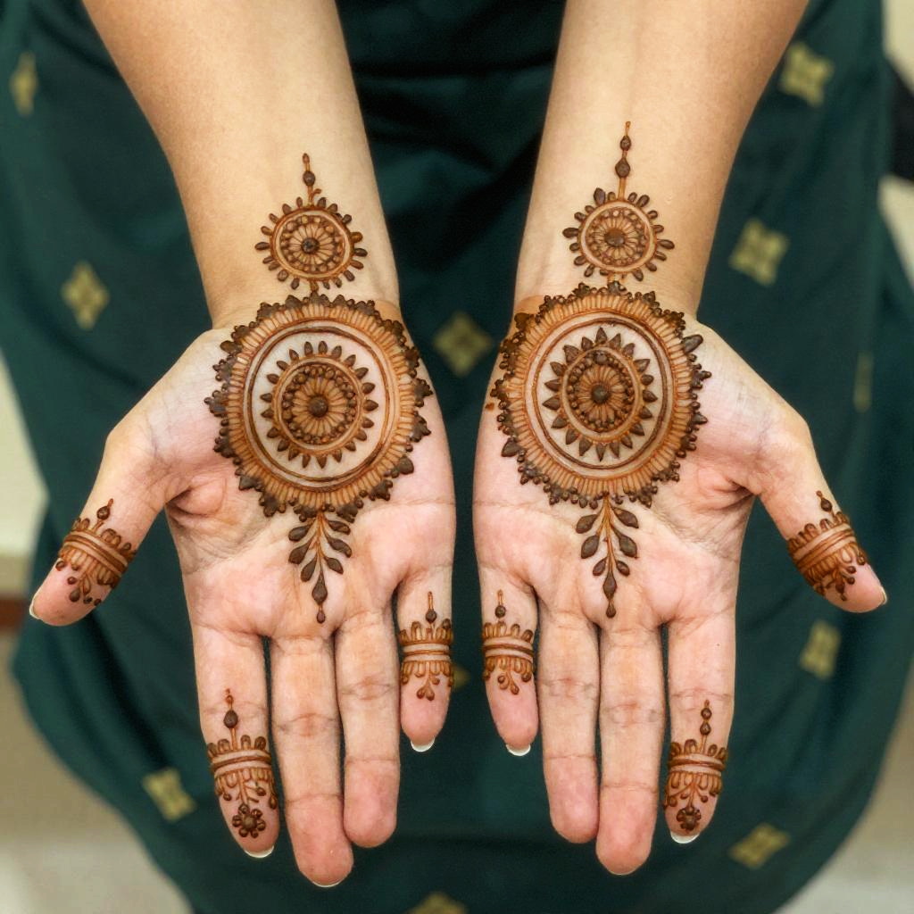 Photograph of a person's hands, palms facing up, covered in intricate black henna designs. The henna patterns are symmetrical, featuring floral and paisley motifs, with additional smaller designs on the fingers. The person is wearing a dark floral top and a gold bangle on their right wrist. The background is softly blurred, focusing attention on the detailed henna work.