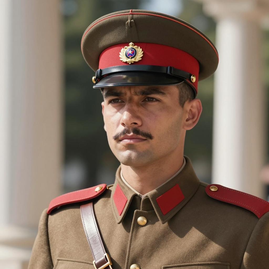 Photorealistic image of a male soldier wearing a WWII-era Soviet military uniform. The soldier has a stern expression, short brown hair, and medium build. He is dressed in a green uniform with red shoulder patches, a peaked cap featuring a red emblem, and brown leather straps with a belt and pouch. The background shows a brick building with blurred people walking by, captured in an outdoor daytime setting with realistic lighting and shadows.