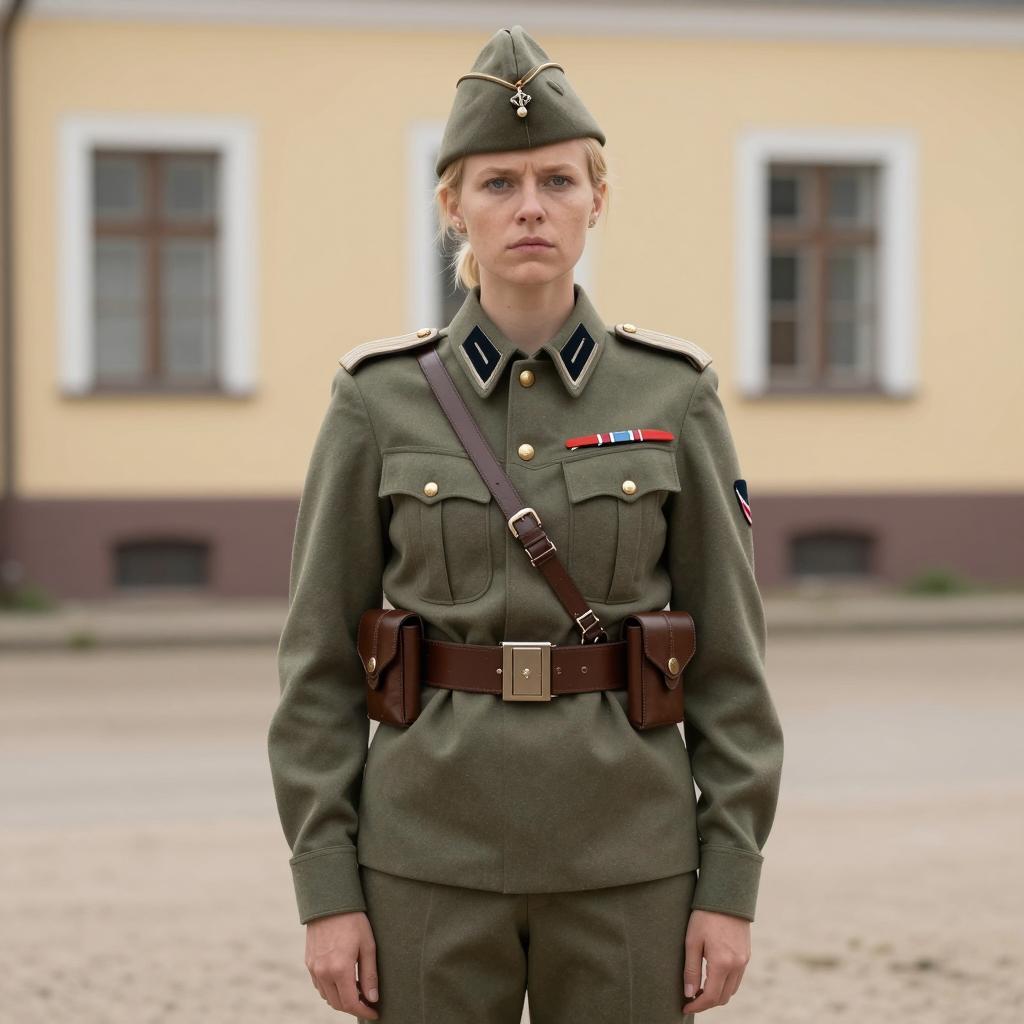 Soviet soldier costume, photorealistic, male soldier, WWII-era, green military uniform, peaked cap, red emblem on cap, red shoulder patches, brown leather straps, belt with pouch, stern expression, medium build, short brown hair, brick building background, people in the distance, daytime, detailed ures, realistic lighting, standing pose, historical military attire, facial features sharp, realistic shadows, outdoor setting