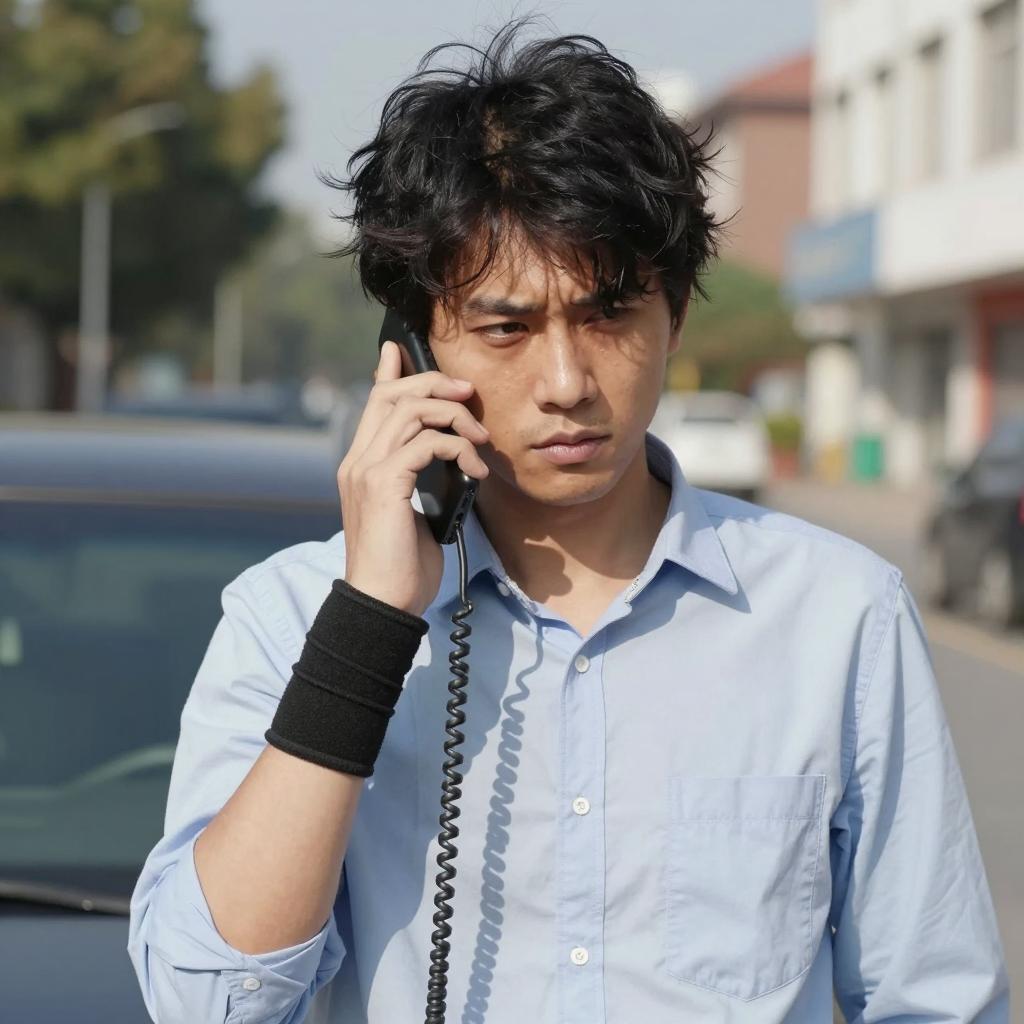 Man with messy black hair, wearing a light blue shirt, stands next to a car, holding a corded phone to his ear with his right hand. His left arm is secured with a black wrist cuff. Background includes blurred trees and buildings. Man has a serious expression. Sunlight casts shadows on his face. Outdoor scene.