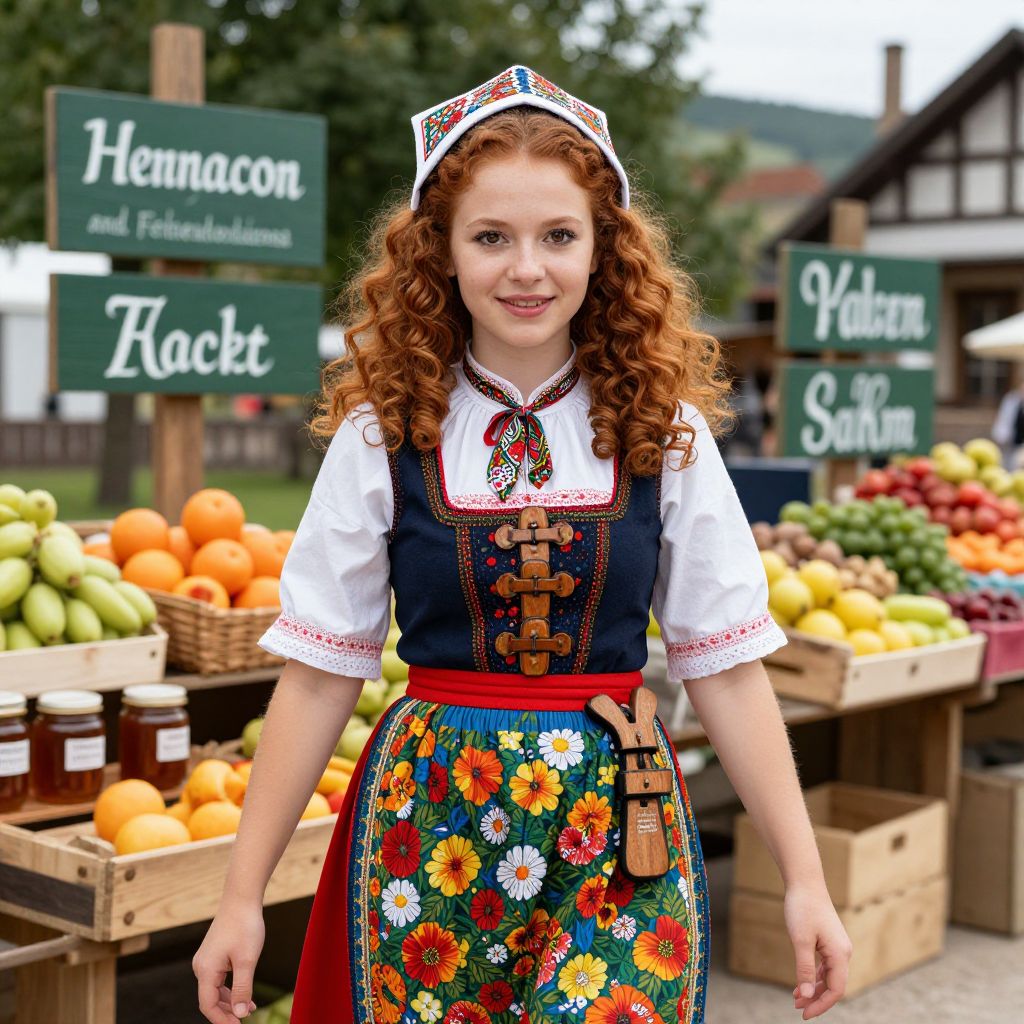 Photograph of a young Caucasian woman with curly red hair, wearing a traditional German dirndl dress. The dirndl features a white blouse with red embroidery, a navy blue bodice with brown wooden buttons, and a colorful floral skirt. She has a white headscarf with a patterned trim. She stands in front of a vibrant outdoor market stall displaying baskets of apples, oranges, and jars. Green signs read "Hennamann" and "Vogelwirt." The background includes blurred trees and market stalls, creating a lively, colorful scene. The overall style is bright and cheerful, capturing a traditional cultural setting.