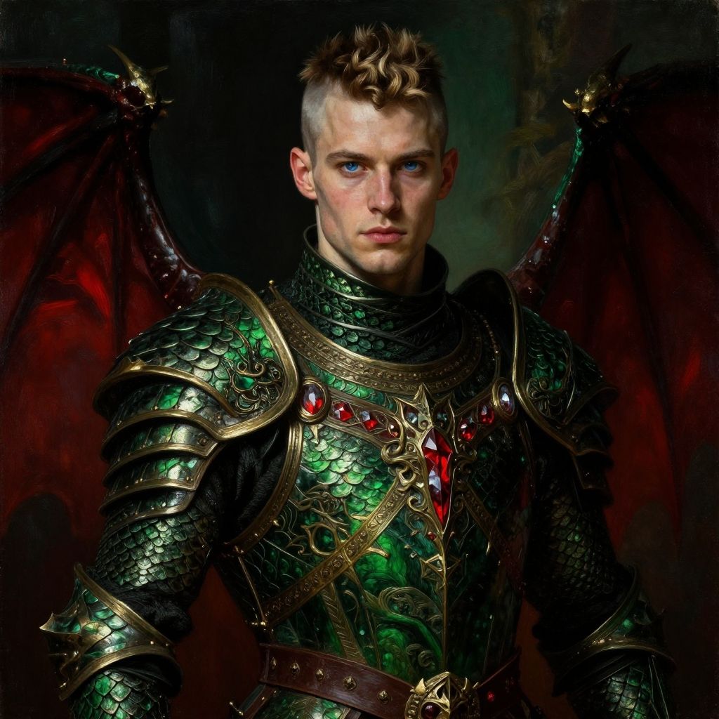 Photorealistic oil painting of (Handsome:1.1) (Polish) (Irish) (Slavic) (bright sapphire eyes) (half-dragon warrior-prince:1.2) with (intricate metallic red brass scales seamlessly melded into arm and neck:0.9), 18-year-old, (darkblonde undercut short hair:1.1), (medieval fantasy clothing:1.2), grimdark fantasy, (medieval) fantasy, high fantasy, epic fantasy, (upper body:1.3) (medium shot:1.3) taken with (fujifilm xt3:1.1), film grain, dark style, raking light dramatic hard shadows, (dramatic lighting:0.9), material contrast, cinematic composition, intricate details, masterpiece, visually stunning, evocative, vivid deep hues, brass, red Crystal, (body transformation:1.2), , realistic eyes, scaleborn, scales, undercut, royal, red armor, symmetrical armor, flaccid short mohawk