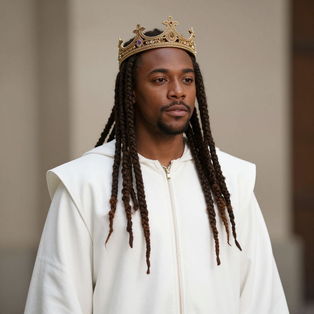 Photograph of a Black man with dark brown skin, wearing long, thick, black dreadlocks and a gold, ornate crown. He is dressed in a pristine white, long-sleeved robe with a high collar. His expression is serious and composed. The background is blurred but appears to be an indoor setting with neutral-colored walls. The lighting is natural, highlighting the contrast between the white robe and his dark skin. The image has a slightly soft focus on the background, keeping the subject in sharp detail.