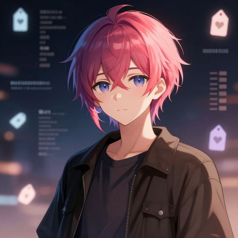 Anime character portrait in deepdanbooru style, detailed clothing textures and vibrant hair colors, soft ambient lighting, background filled with floating tag icons and metadata, digital art with smooth shading and anime aesthetics