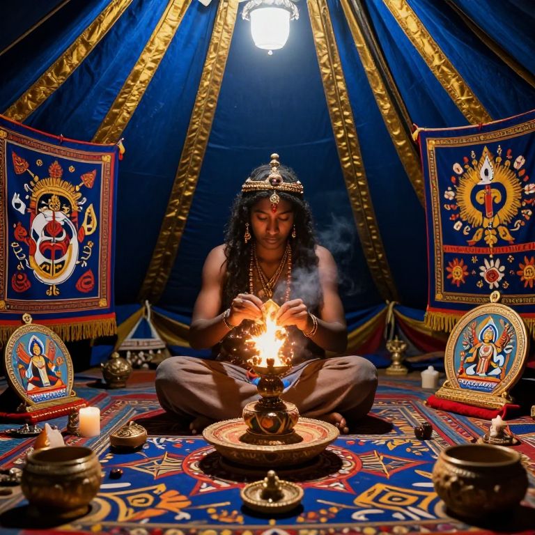 Oholiab crafting sacred objects with precision in a richly decorated tent, surrounded by blue and gold tapestries, symbolic religious artifacts, and vibrant tribal patterns, with a mystical aura of divine inspiration and creative energy enveloping the scene.