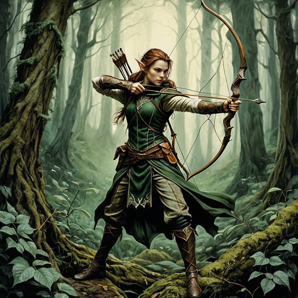 An amazing piece of art, depicting an agile elves archer from Marvel comics, full body, in the style of forest green and soft brown, Brian Froud, fairy tale illustration.