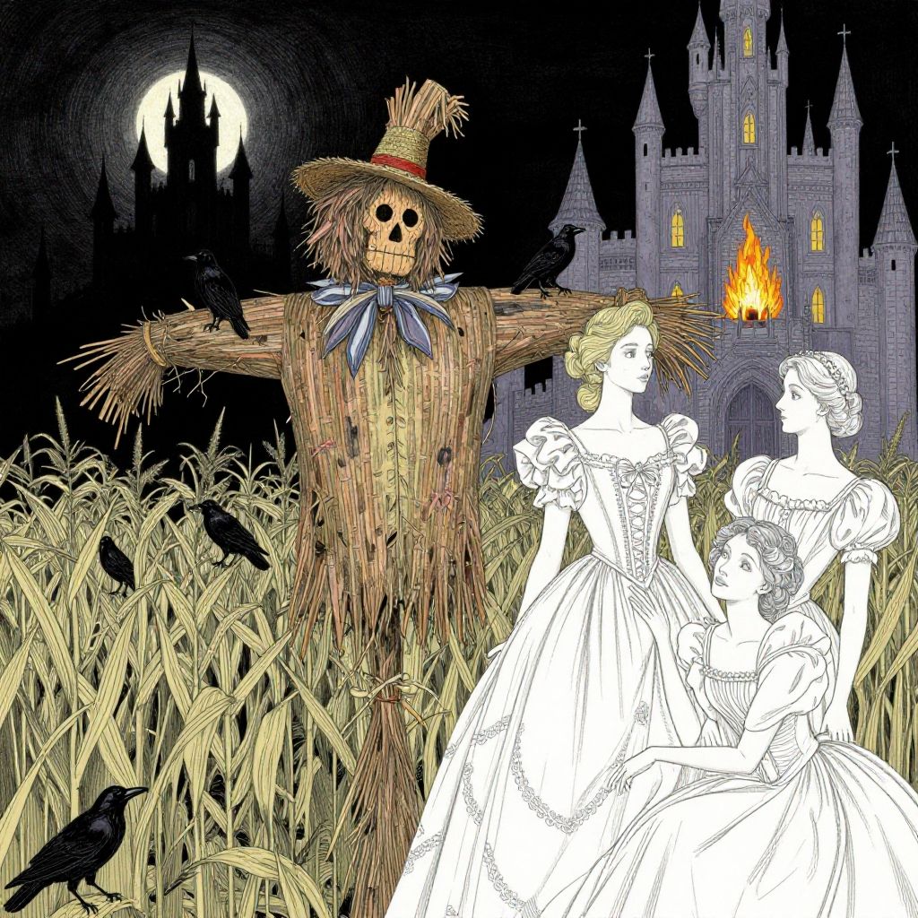 Highly detailed linework reminiscent of Carne Griffiths, (scarecrow:1.7), (crows:1.4), imbued with Wadim Kashim's bold color and texture, light and airy as Carl Larsson's compositions, dark background, dark, evil, castle, fire, featuring Pascal Blanche-style hyper realistic characters, pastel, elegance, dramatic lighting, expressive camera angle, matte, concept art, corn field, moon