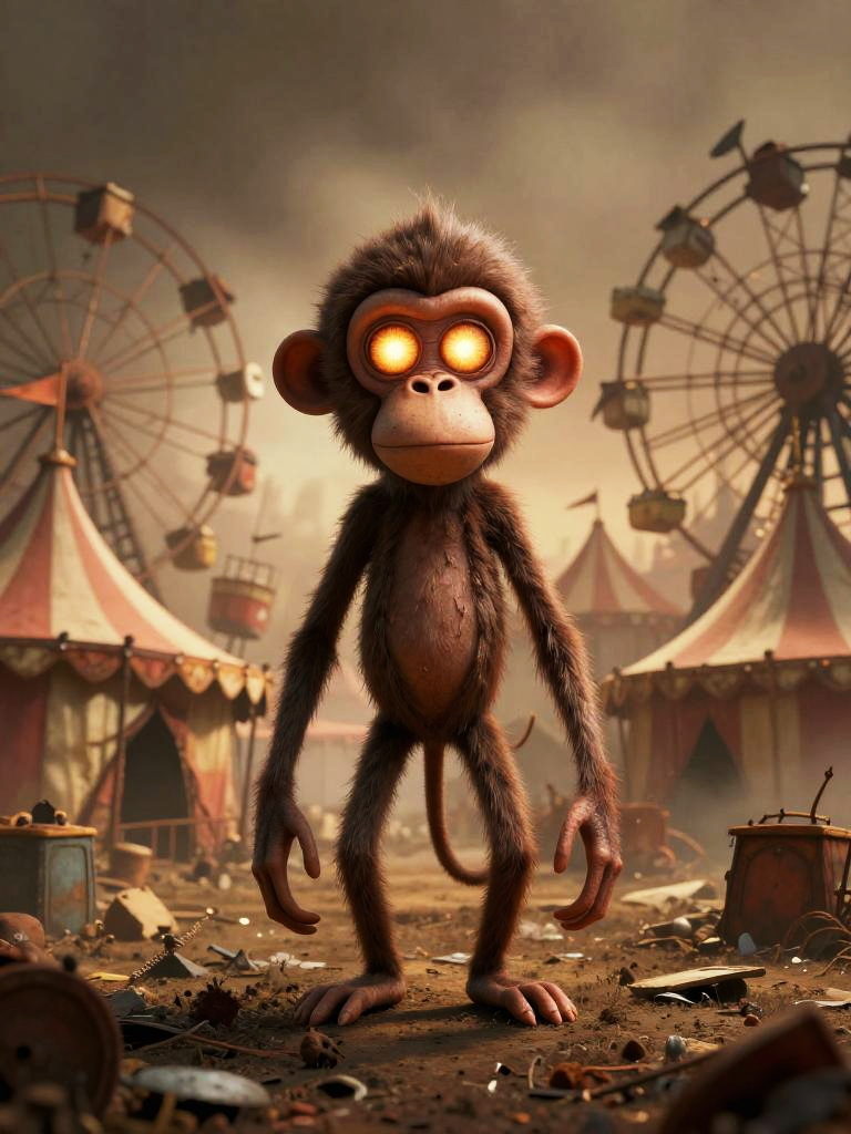 This digital CGI image features a cute, anthropomorphic baby monkey standing in the center of a chaotic, abandoned carnival. The monkey has large, glowing yellow eyes, a small white nose, and a fur-covered body with brown and black hues. Its expression is curious yet slightly eerie. Behind the monkey, two large, dilapidated Ferris wheels and several colorful, tattered circus tents are visible. The ground is littered with debris, including broken pieces of wood and metal. The sky above is cloudy and dark, adding to the eerie atmosphere. The lighting is dim, with a warm, eerie glow highlighting the monkey and the background carnival structures.