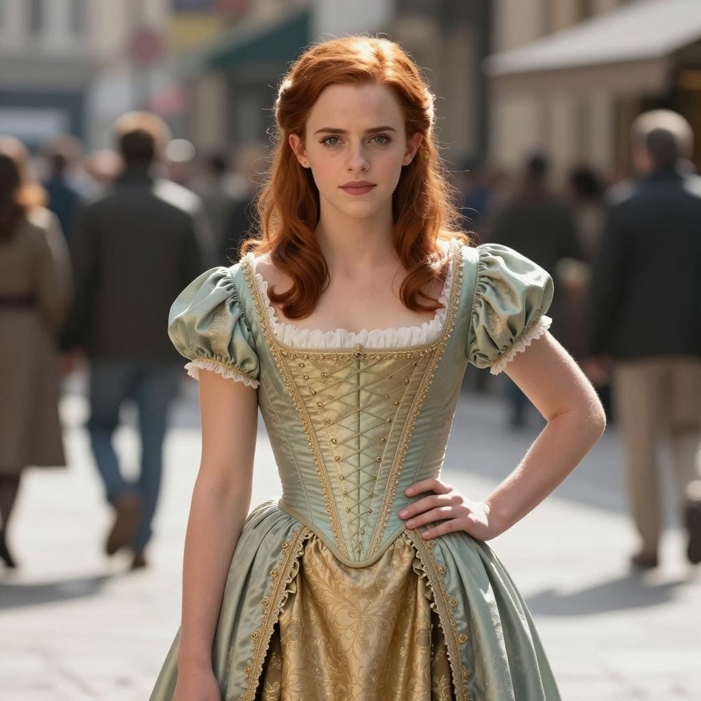 Todd margo costume, photorealistic, digital art, couple standing on city street, red-haired woman with wavy hair in gold dress with red belt, muscular man with brown hair in light blue dress with brown belt, urban background with buildings and pedestrians, warm sunlight, vintage fashion, realistic ures, romantic atmosphere, standing close, man's arm around woman's waist