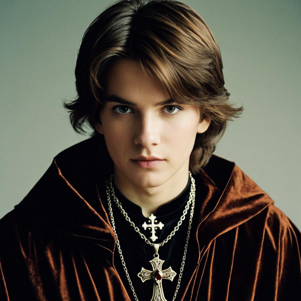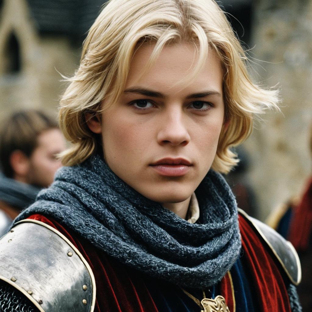 Portrait of a young Caucasian man with blonde hair wearing a medieval-style costume. He is dressed in a dark velvet garment with metal shoulder armor and a thick knitted scarf. The background is blurred, highlighting the subject's serious expression and direct gaze.