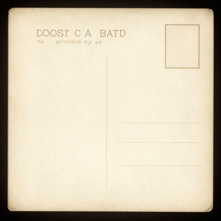 Recto side of a vintage postcard from the 1920s, sepia tones and retro typography, worn edges and creased corners, nostalgic mood, detailed paper fibers visible, ambient soft light with a gentle vignette for old-time charm.