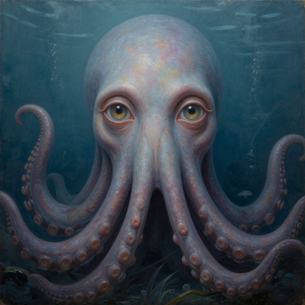 This digital painting depicts a realistic, eerie underwater scene of a large, blue-gray octopus with expressive, yellow-brown eyes. The octopus has eight elongated, slightly curled tentacles adorned with small suction cups. The background is a gradient of dark blue, giving the impression of deep ocean depths. Light reflections and subtle textures on the octopus's skin add a lifelike quality. The octopus's face is centered, with a calm, almost humanoid gaze, creating a haunting, mesmerizing effect. The overall style is highly detailed and realistic, with a slightly surreal touch.