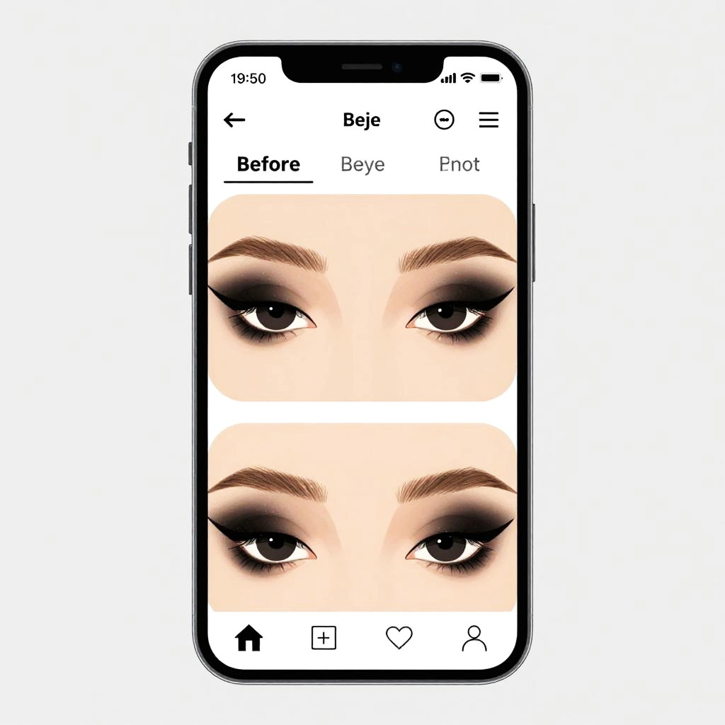 Illustration of black eye filter online on a smartphone screen, showing before and after effect with dramatic darkened eye makeup, modern flat design, clean and minimalistic background, emphasis on beauty technology and social media trends