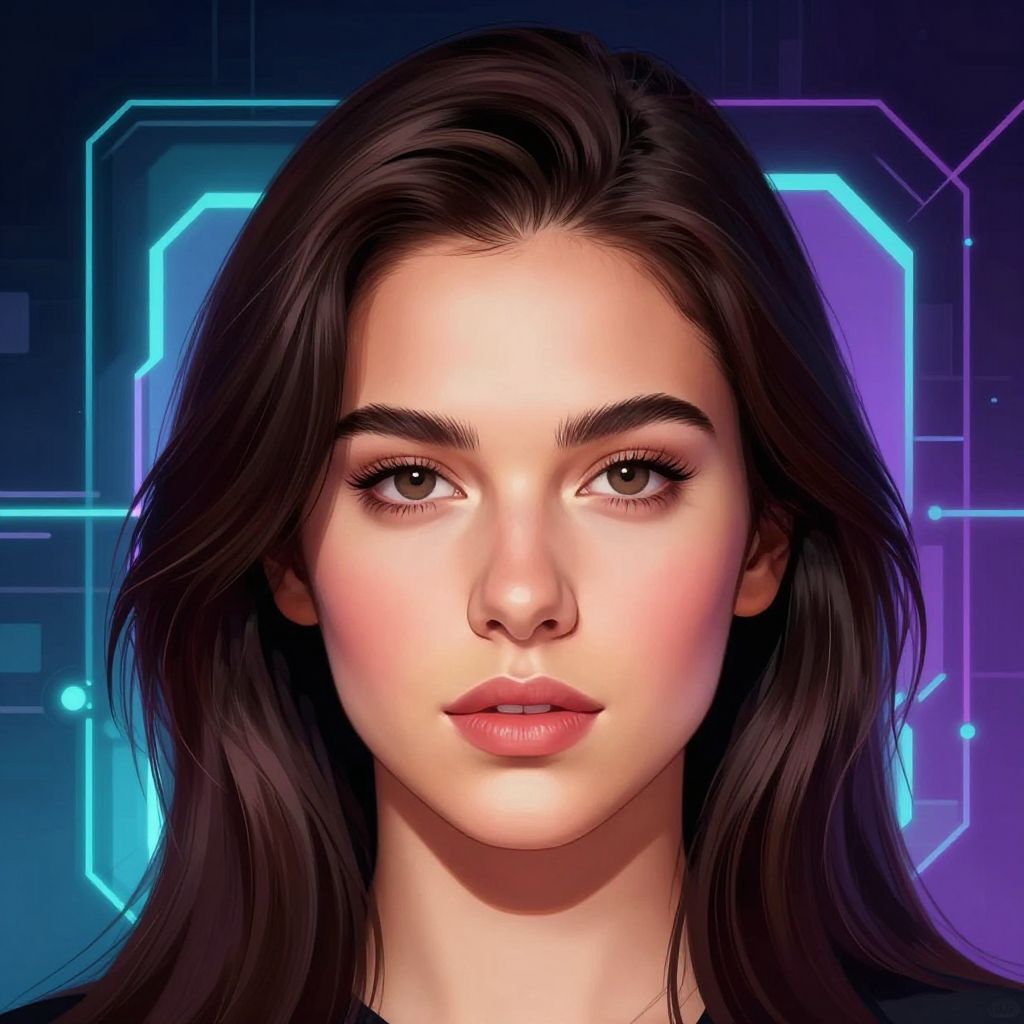Digital artwork of a young woman with fair skin and long, straight, dark brown hair. She has large, almond-shaped brown eyes with subtle eyeliner, full pink lips, and a small nose ring in her right nostril. Her expression is neutral, with a slight hint of seriousness. The background features a neon blue and purple geometric pattern, giving a futuristic, cybernetic feel. The artwork is highly detailed with smooth textures and vibrant colors, emphasizing a modern, digital art style. Her face is centered and fills most of the frame.