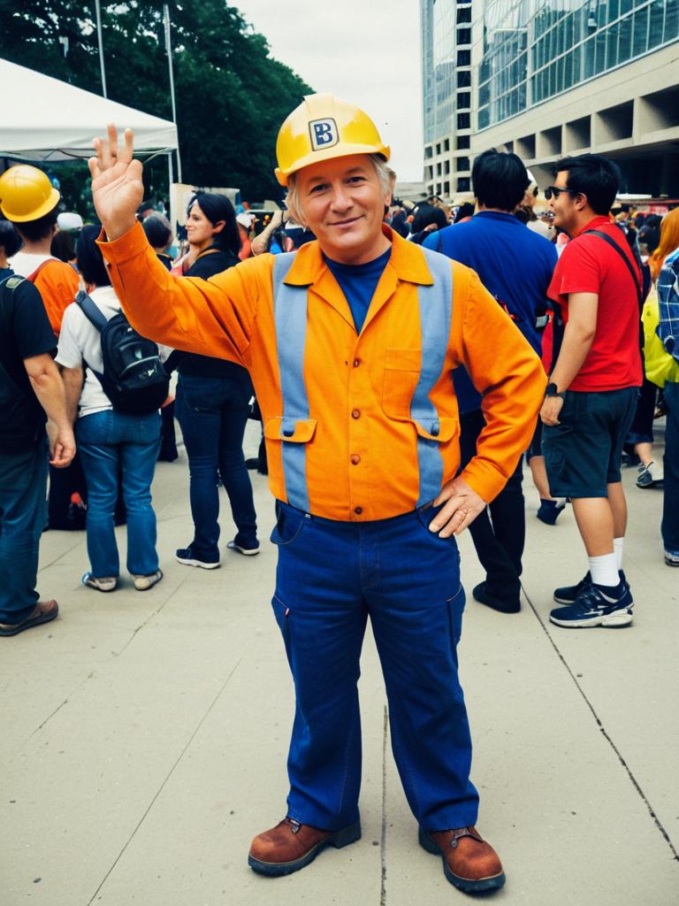 Man in Bob the Builder Costume, cosplay festival photo, photorealistic realism