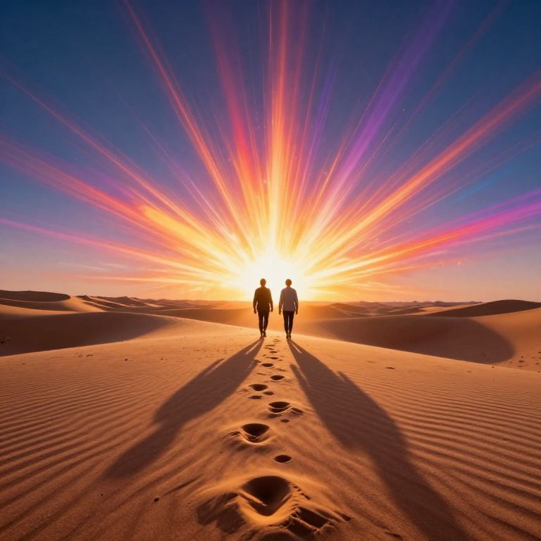 Silhouetted couple walks toward vibrant sunrise in desert, casting long shadows with footprints, colorful rays illuminating clear, blue sky.