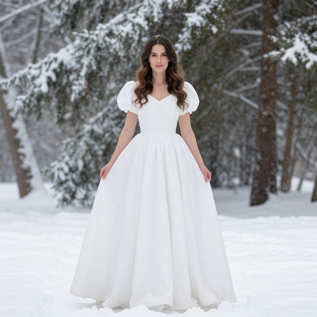 Snow White Dress, a woman in a white dress standing in the snow