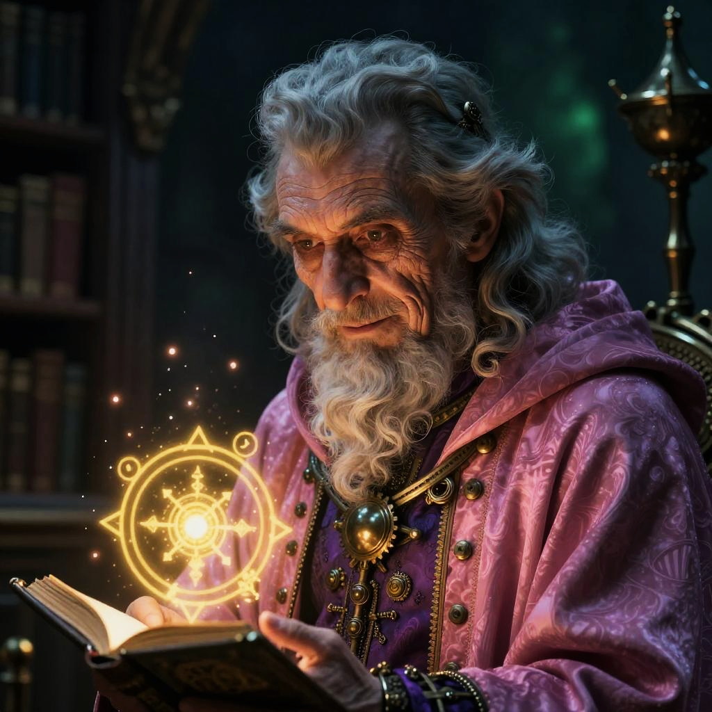A elderly clockwork librarian with a brass monocle and calm, knowing gaze, wearing a antique brass-and-leather corset layered over a high-collared velvet coat, pocketed satchel with visible clock gears and glowing manuscript pages with a hourglass entwined with a skeleton key emblem. The artwork is a highly detailed digital painting, showcasing glowing accents and intricate designs, inspired by the styles of wlop, Mars Ravelo, and Greg Rutkowski.