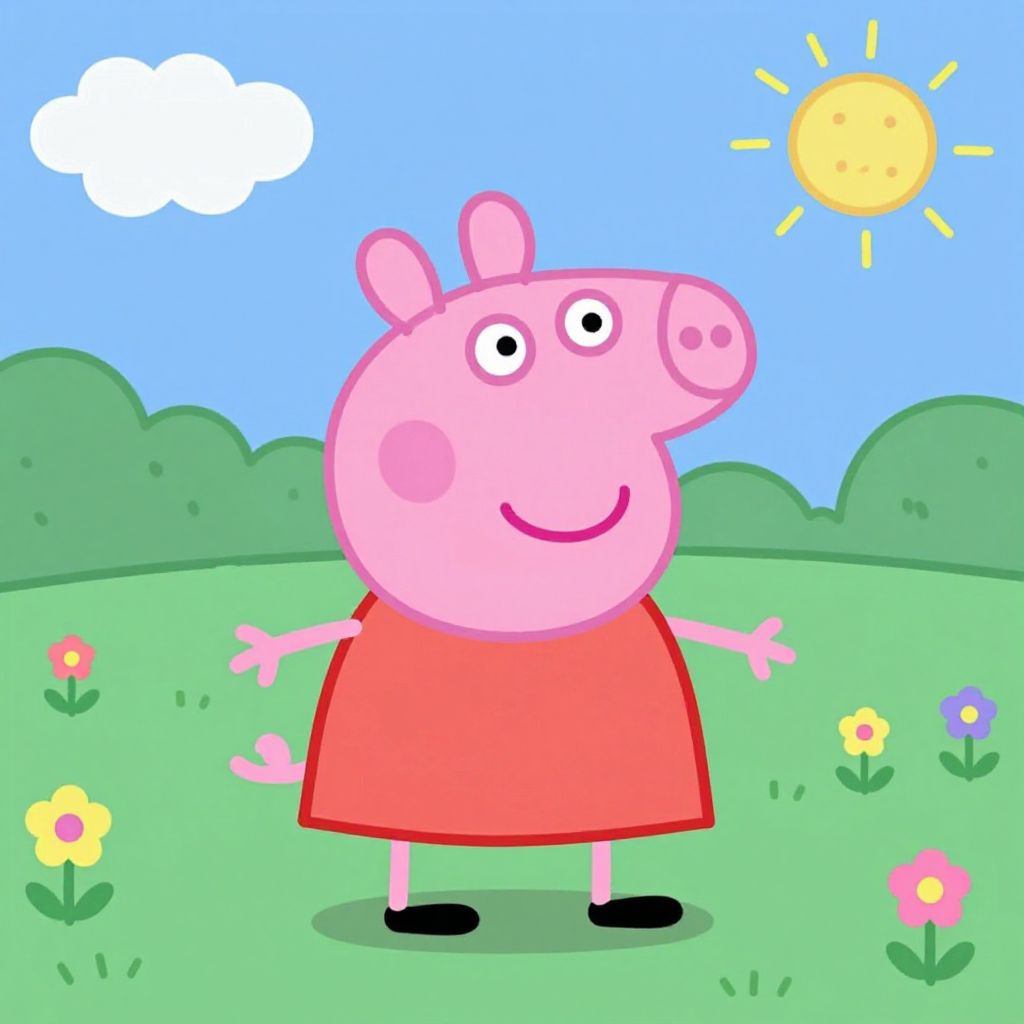 Peppa Pig OC character standing in a colorful countryside setting, cartoon style with vibrant colors, simple shapes, joyful expression, surrounded by blooming flowers and a sunny sky, playful and child-friendly atmosphere.