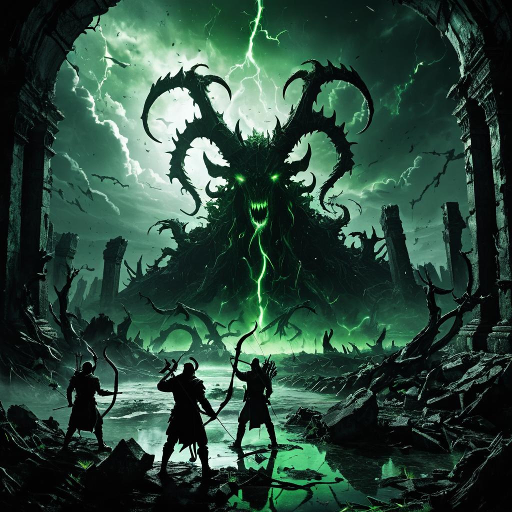 Shadow archers among twisted ruins defending a dying star, a clash of dark and light, shadowy tendrils, demonic horns, digital art, heavy shadows, distorted proportions, glowing silhouette, sinister cloud formation, venomous green color, cracked earth, flowing water, fear