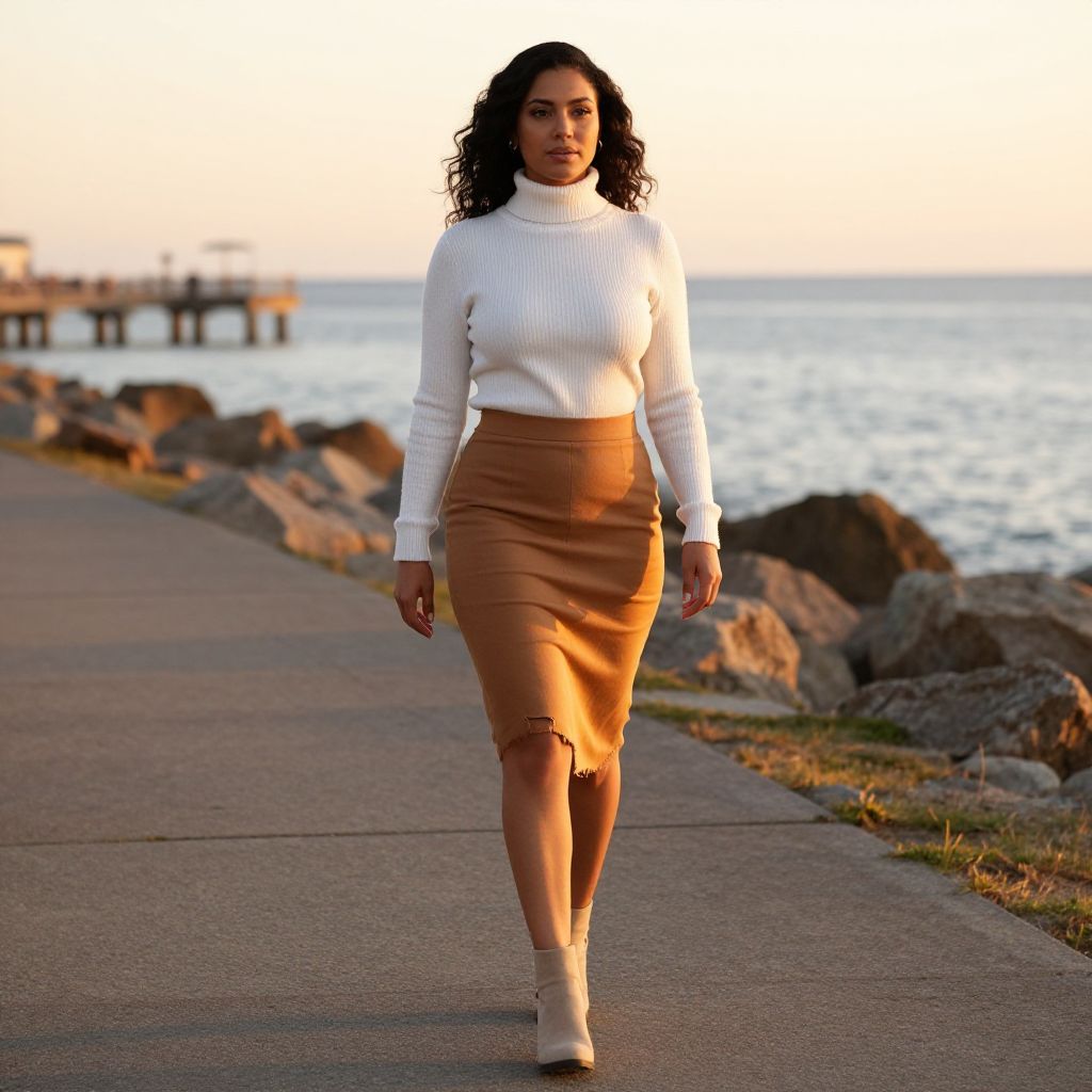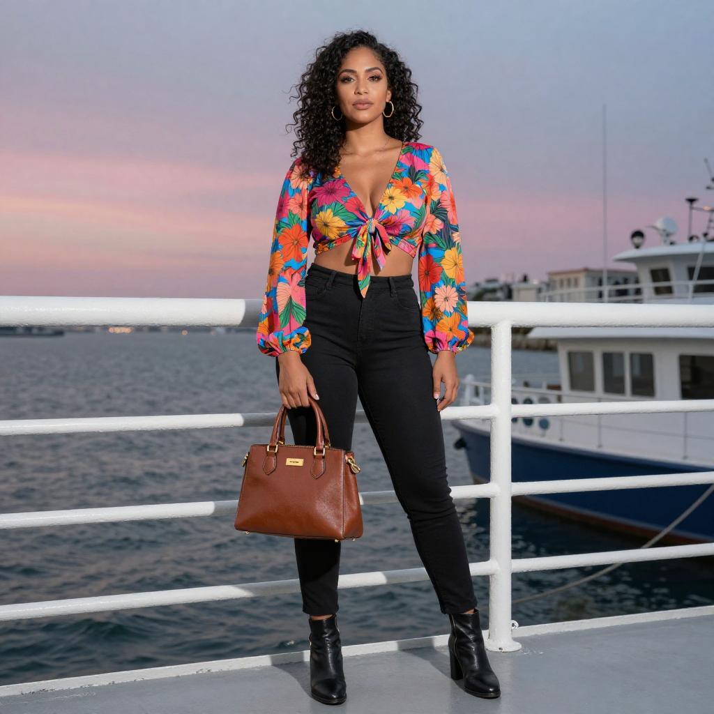 Photograph of a confident woman with medium tan skin and curly black hair standing on a waterfront deck during sunset. She's wearing a vibrant, floral-patterned, long-sleeve crop top tied at the front, black high-waisted pants, and black ankle boots. She holds a brown leather handbag with gold hardware. A white railing and a boat are in the background, with a calm sea and distant buildings under a pink and blue sky.